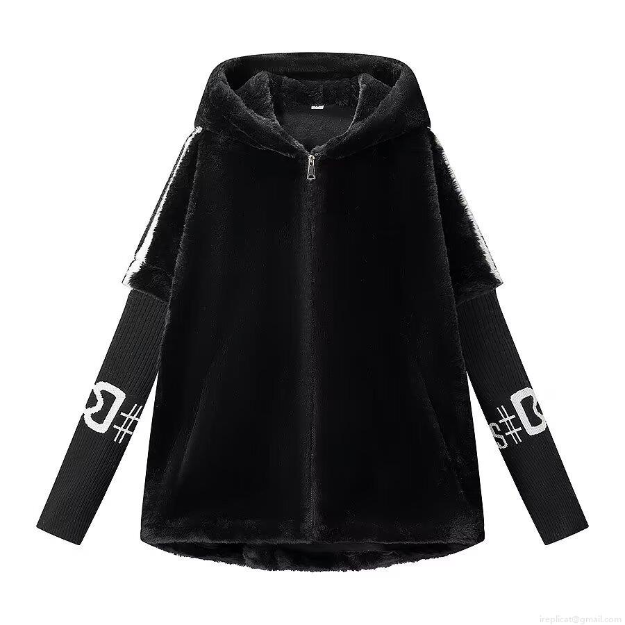 • Women's Faux Fur Hooded Jacket Casual Plush Long Sleeve Zipper Coat With Knit Stitching And Letter Decor Autumn Winter Warm Loose Outerwear Streetwear For Ladies