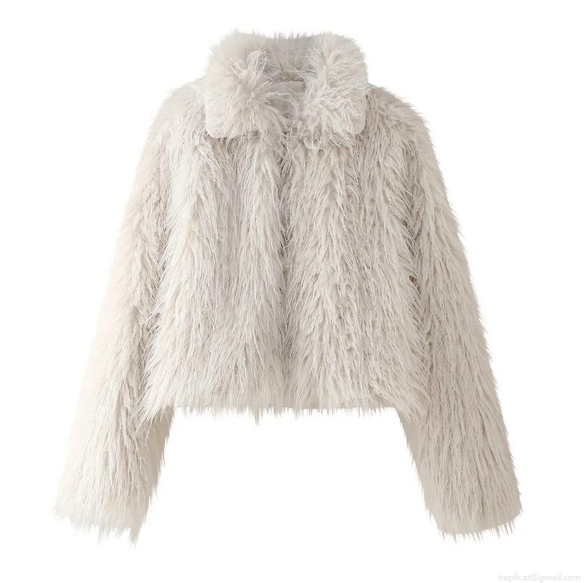 Women's Faux Fur Jacket Creamy White Winter Warm Long Sleeve Loose Fit Casual Outerwear Short Coat Elegant Soft Plush Streetwear Fashionable Lady