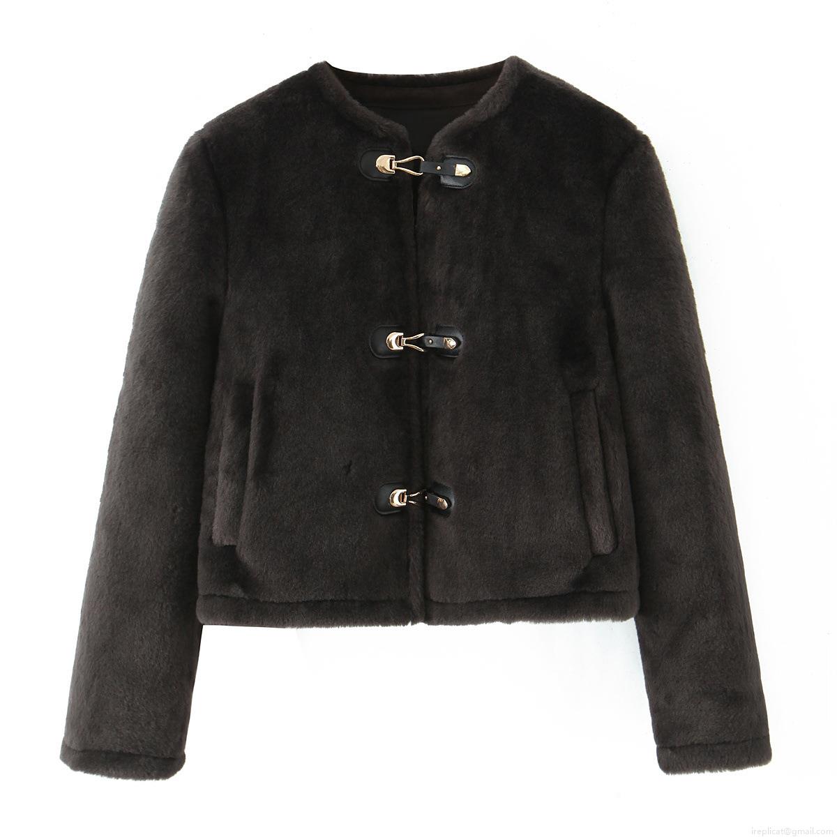 Women's Faux Fur Jacket With Metal Buckle Round Neck Long Sleeve Polyester Streetwear Winter Warm Outerwear Coat