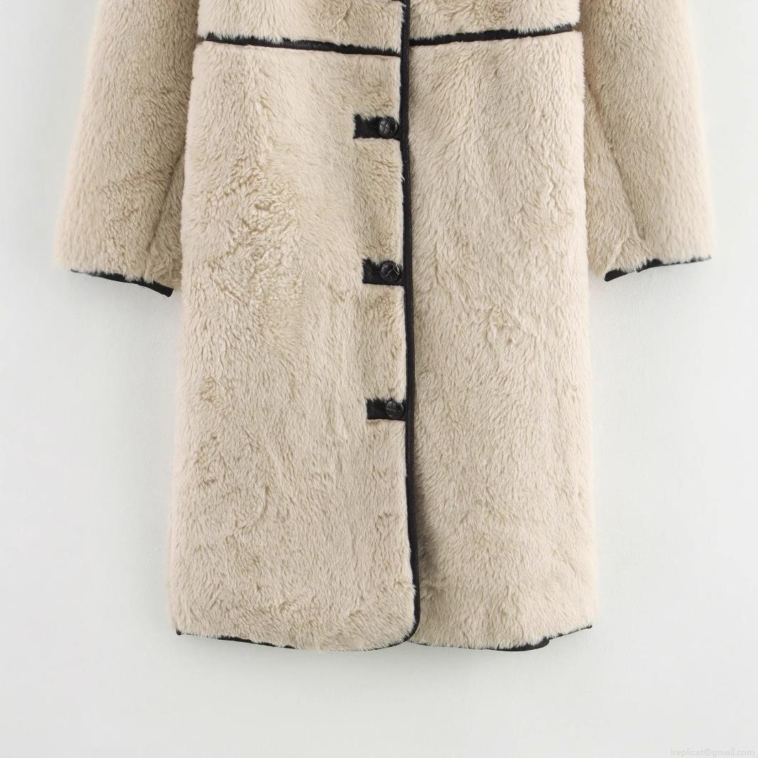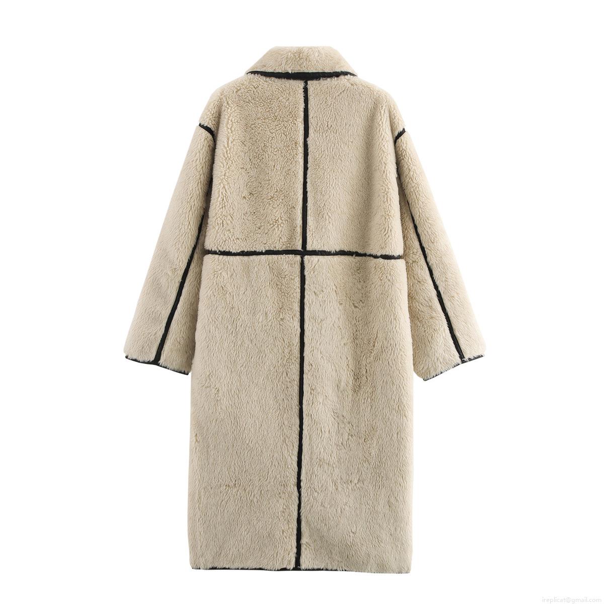 • Women's Faux Fur Long Coat Elegant Beige Lamb Wool Fleece Jacket with Contrast Piping Single Breasted Lapel Outerwear for Winter Casual Party Wear