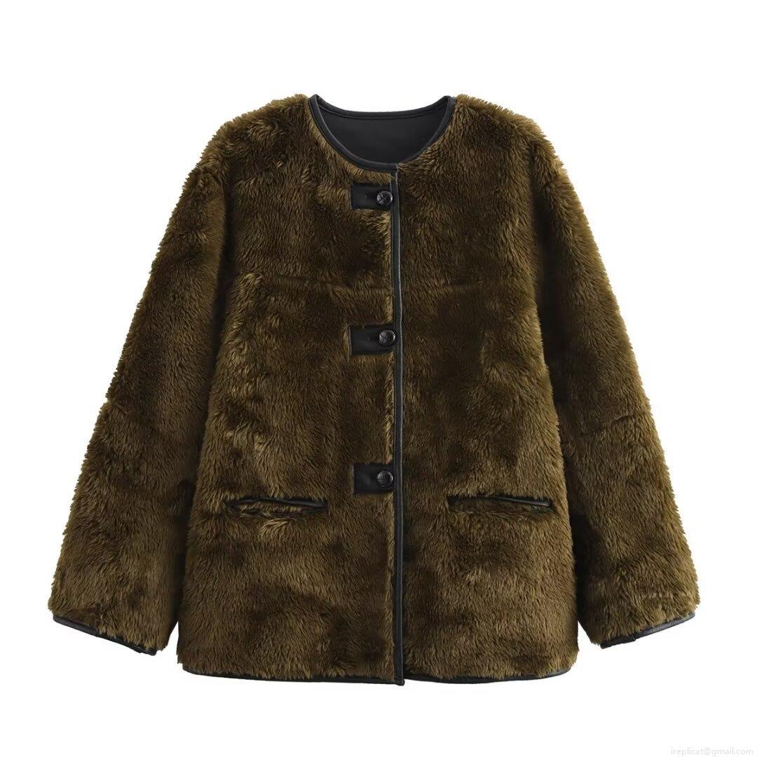 • Women's Faux Fur Plush Jacket Contrast PU Trim Single Breasted Button Up Warm Casual Loose Long Sleeve Coat For Autumn Winter Fashion Outerwear Streetwear