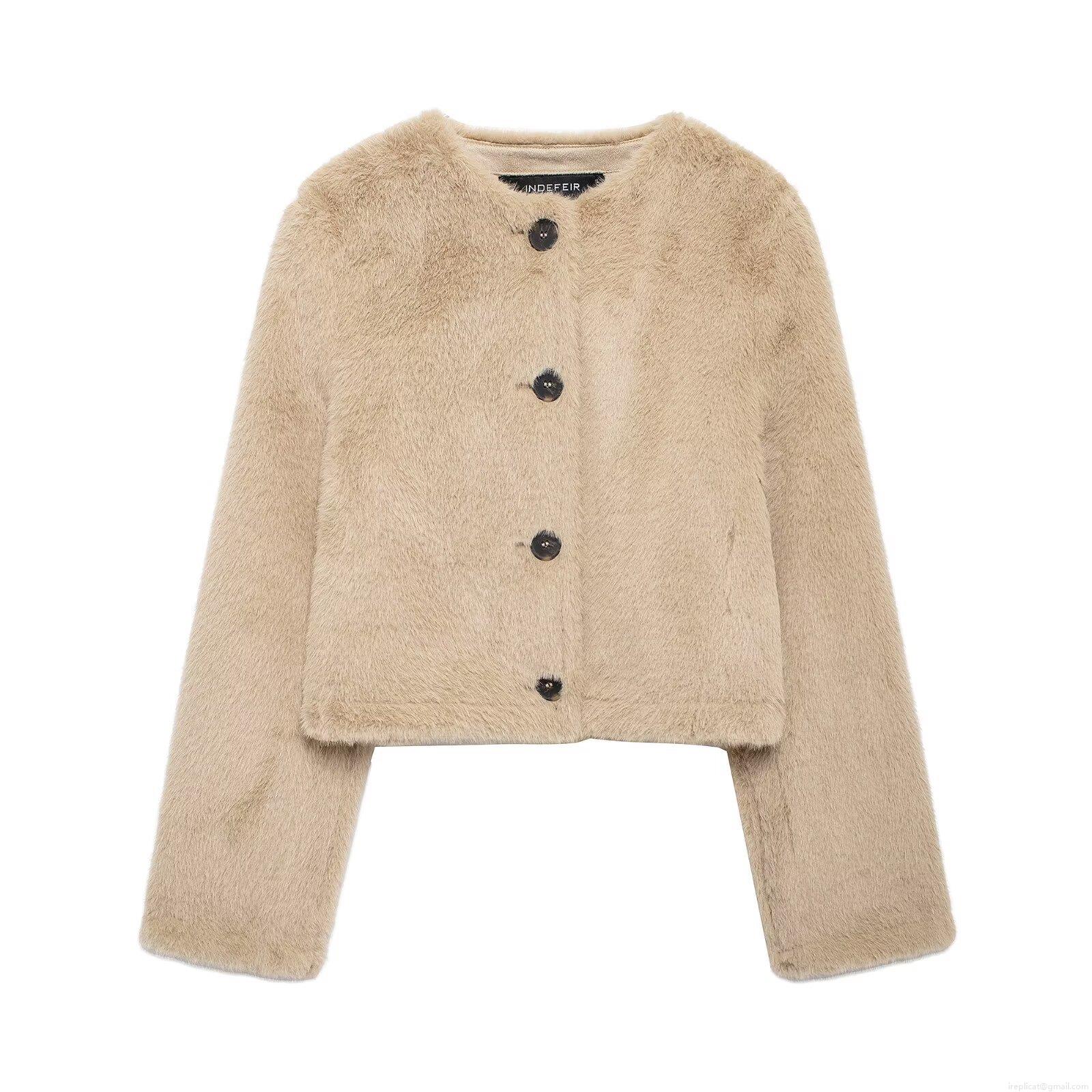 Women's Faux Fur Short Jacket Long Sleeve Round Neck Solid Color Warm Outerwear For Autumn Winter Streetwear Ladies Coat