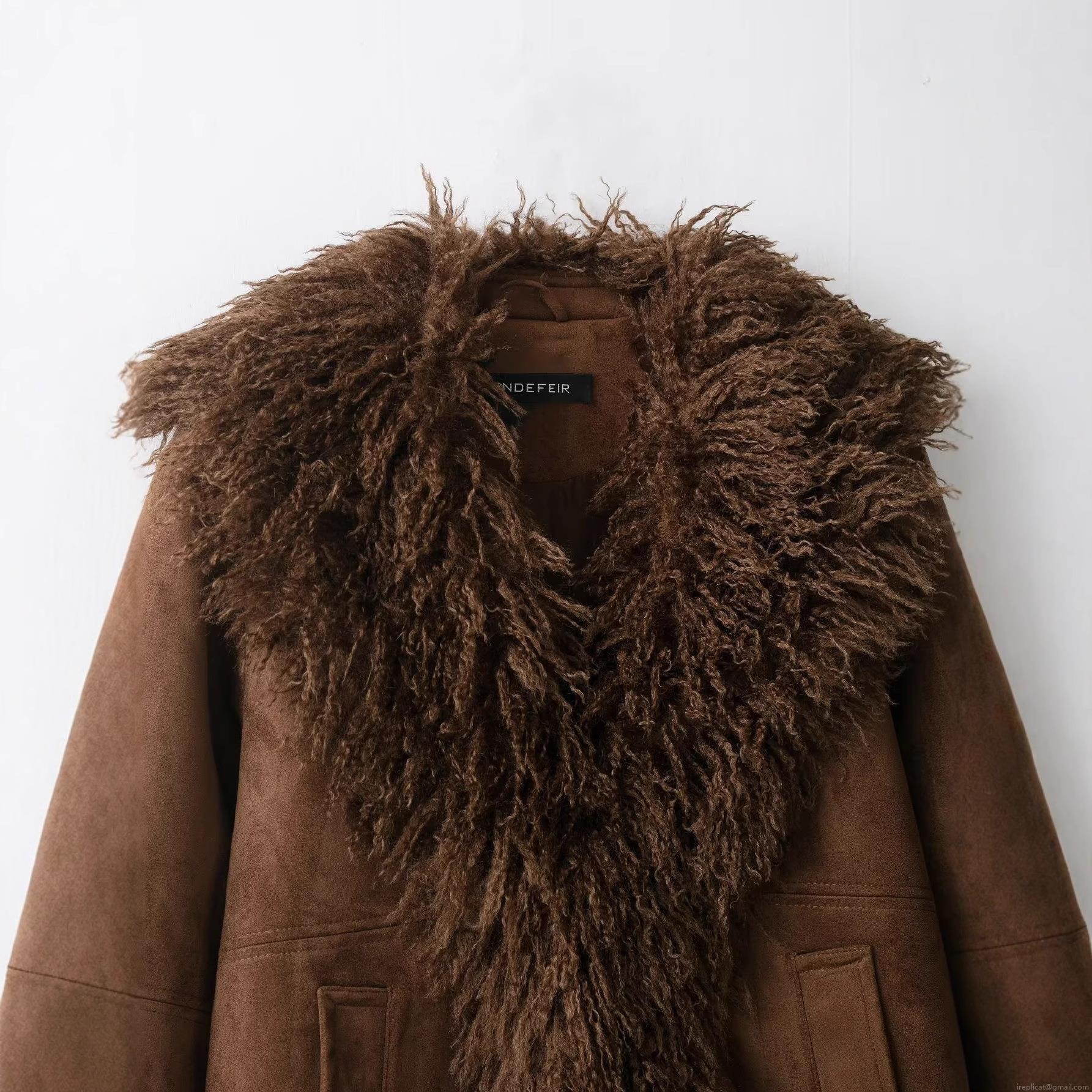 Women's Faux Fur Trim Suede Jacket Oversized Lapel Faux Shearling Coat Long Sleeve Winter Outwear Gothic Street Style Solid Brown Jacket With Pockets