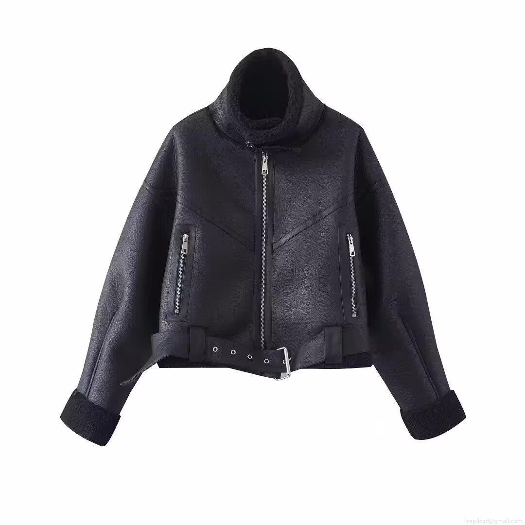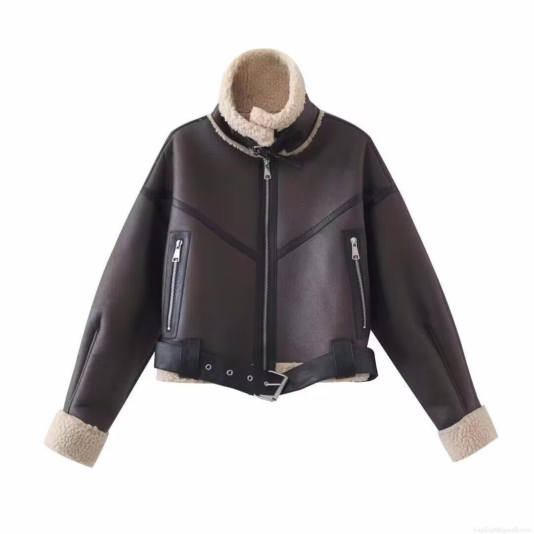 • Women's Faux Leather Biker Jacket Lamb Wool Lining Stand Collar Zipper Short Motorcycle Coat Adjustable Belt Casual Streetwear Outerwear