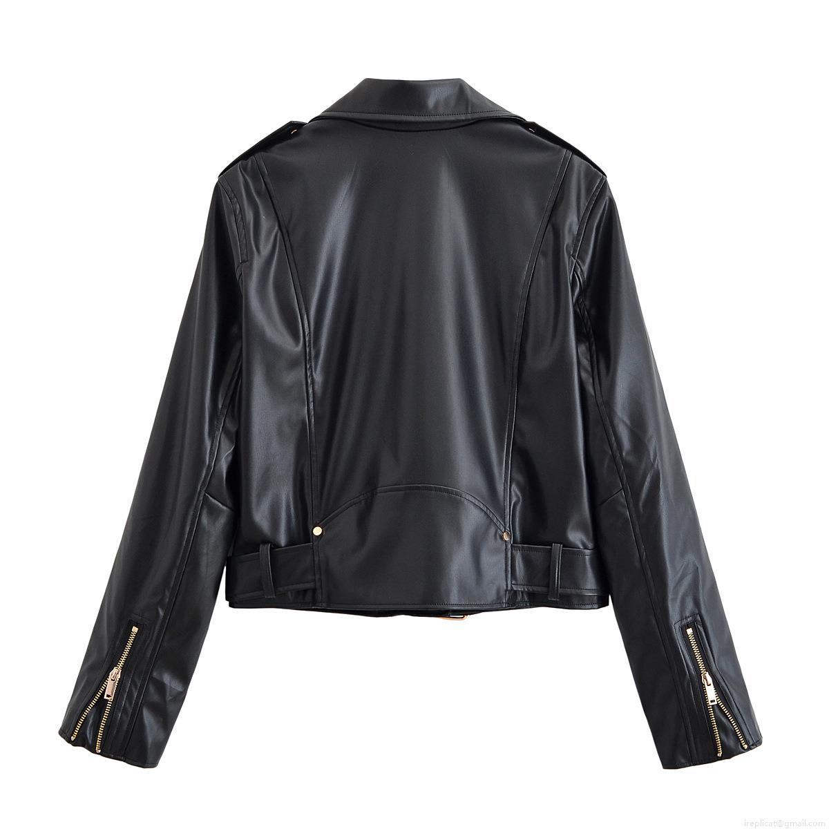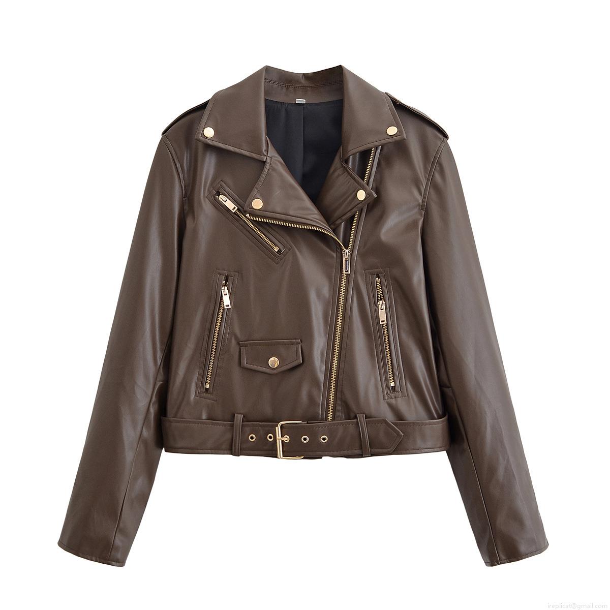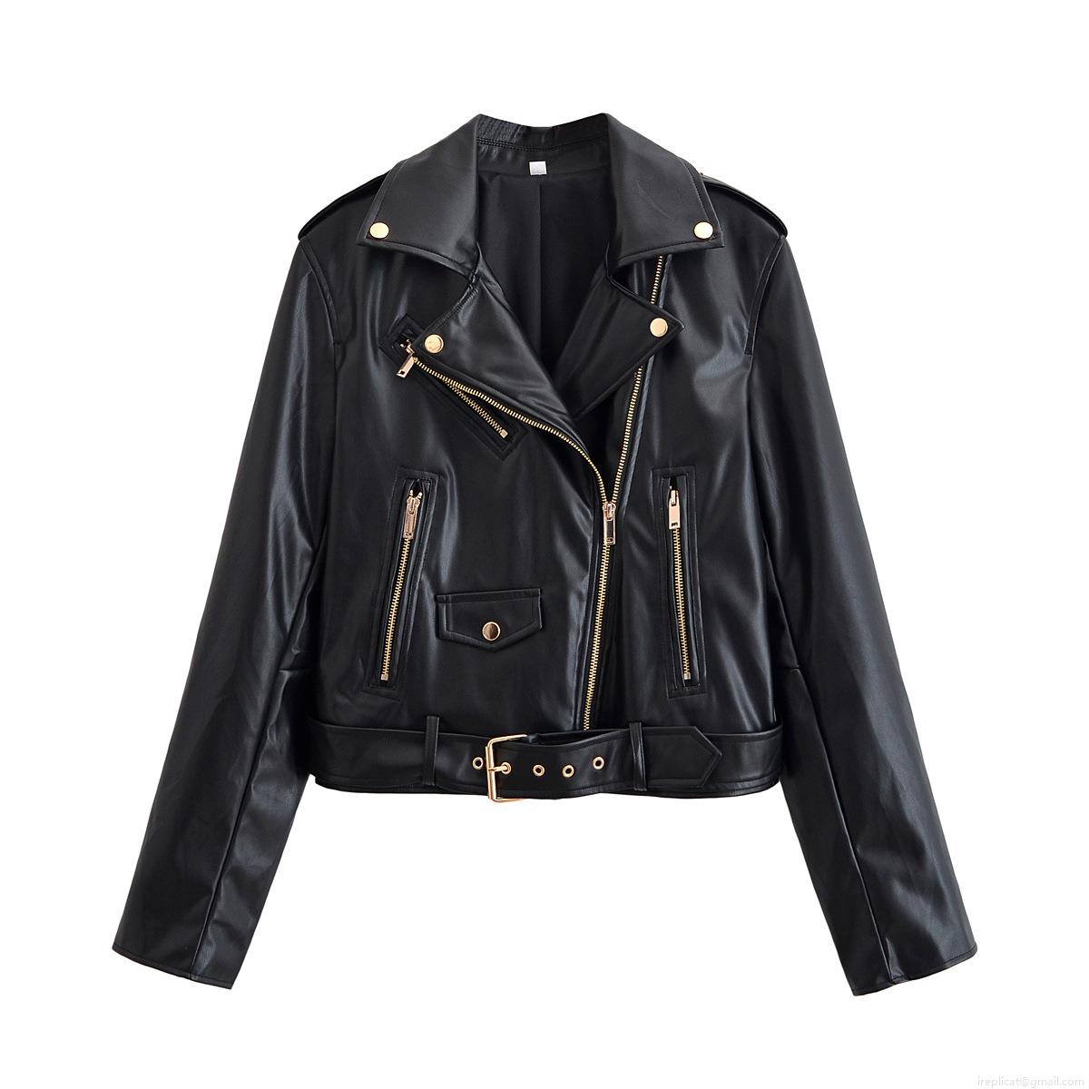 Women's Faux Leather Biker Jacket PU Moto Outerwear With Gold Zipper Belt Solid Color Streetwear Coat For Ladies Spring Fall