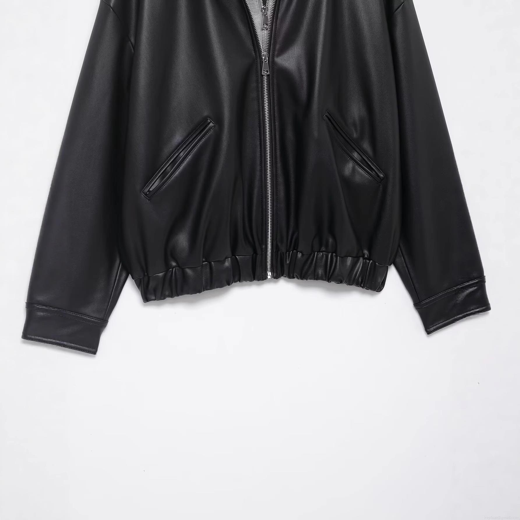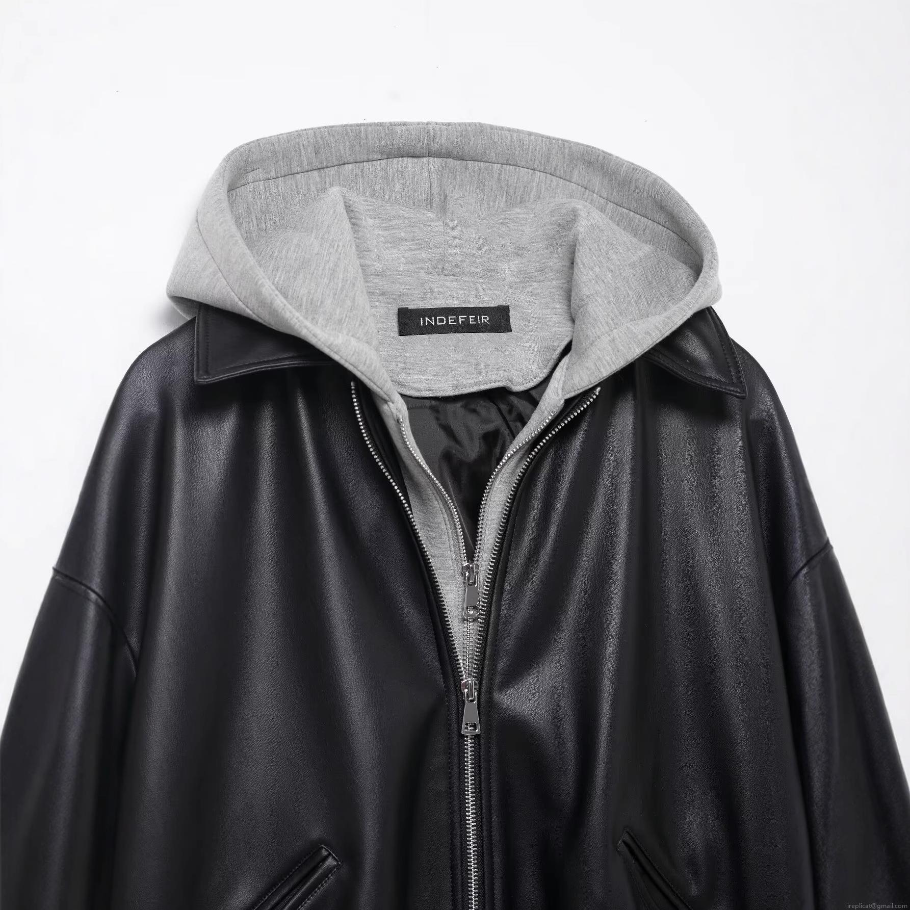 • Women's Faux Leather Jacket Hooded Patchwork PU Leather Zip Up Coat Casual Streetwear Short Outerwear With Grey Knit Hood For Ladies Fall Winter