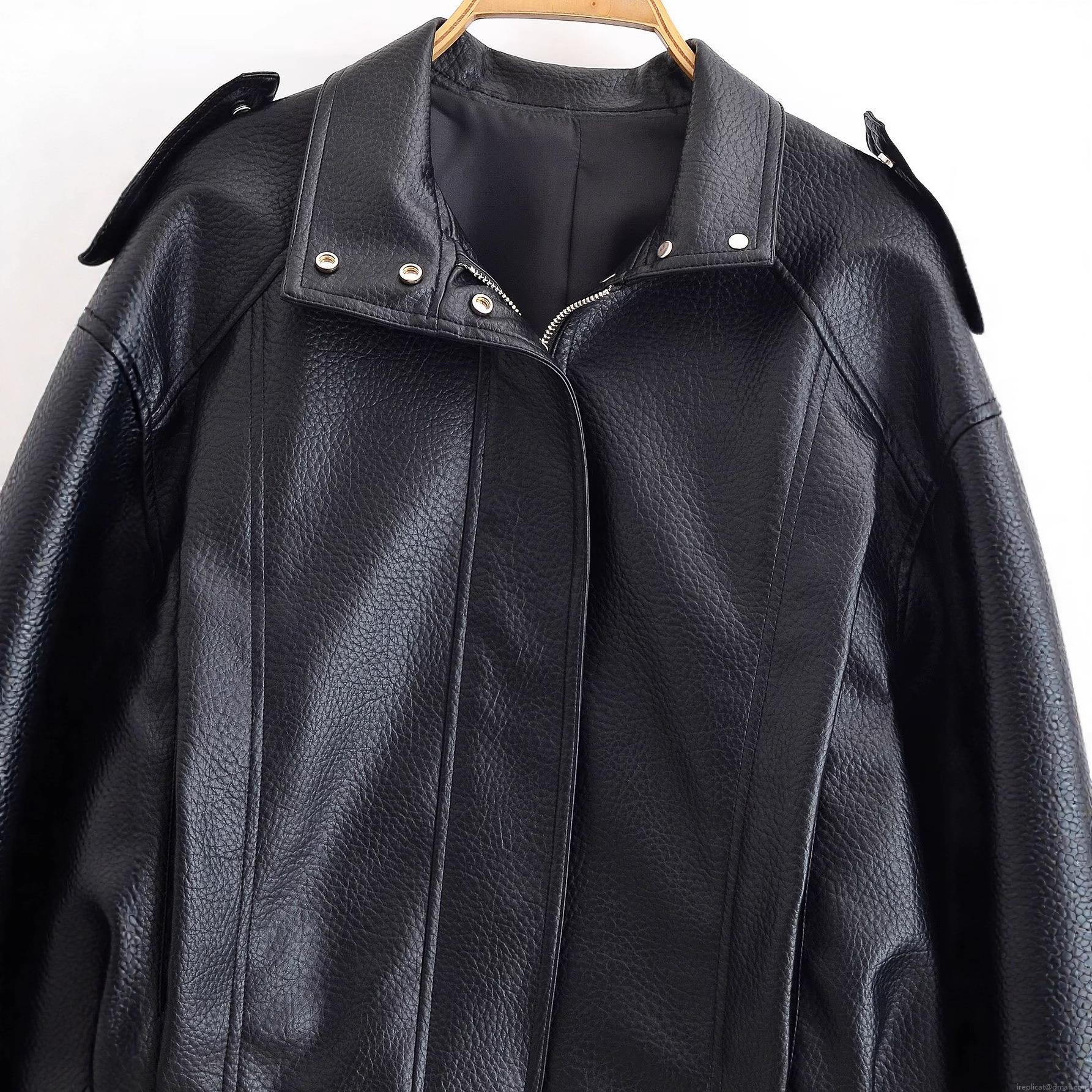 • Women's Faux Leather Moto Jacket Lychee Grain PU Drop Shoulder Zipper Up Casual Streetwear Outerwear For Women Black Long Sleeve Fall Winter Coat