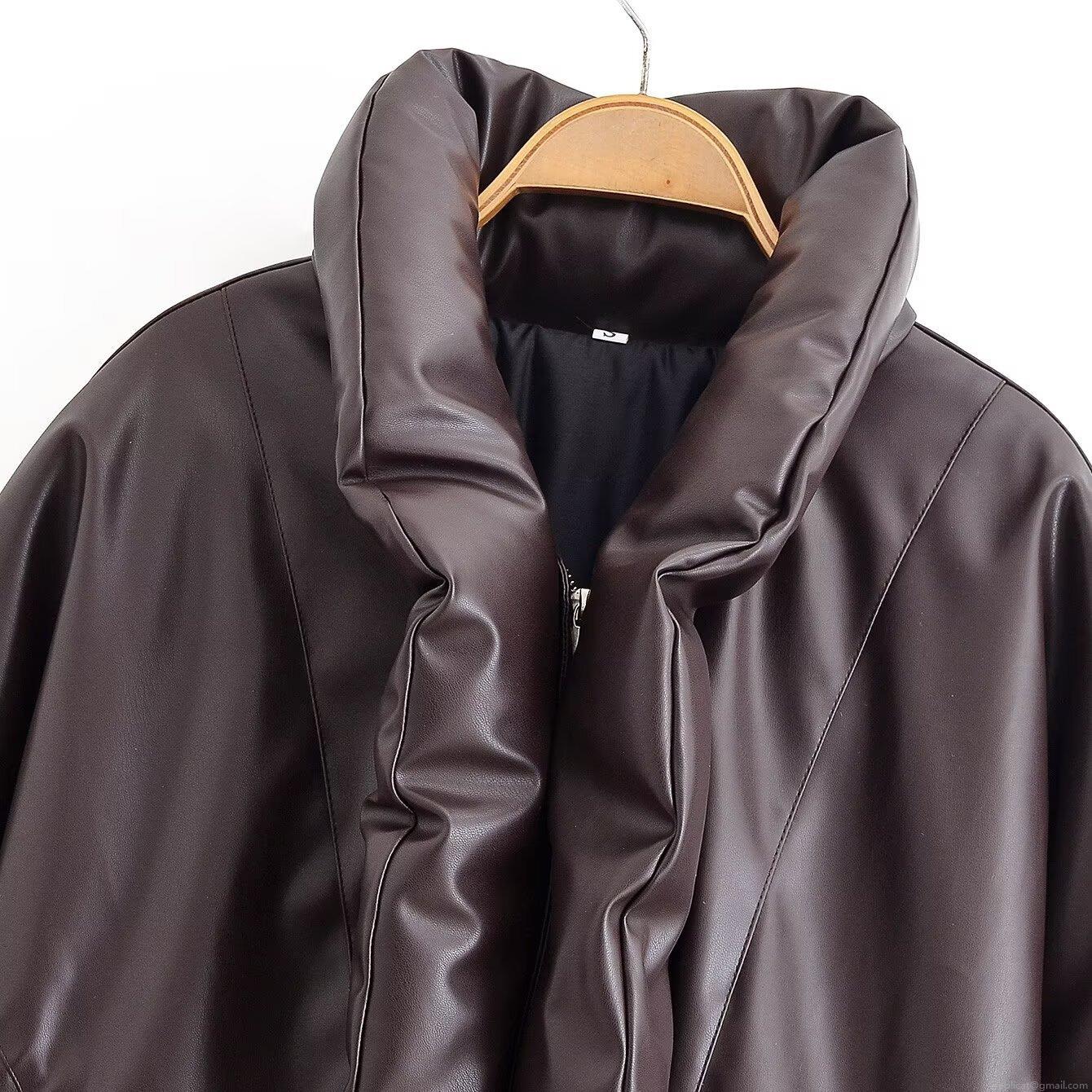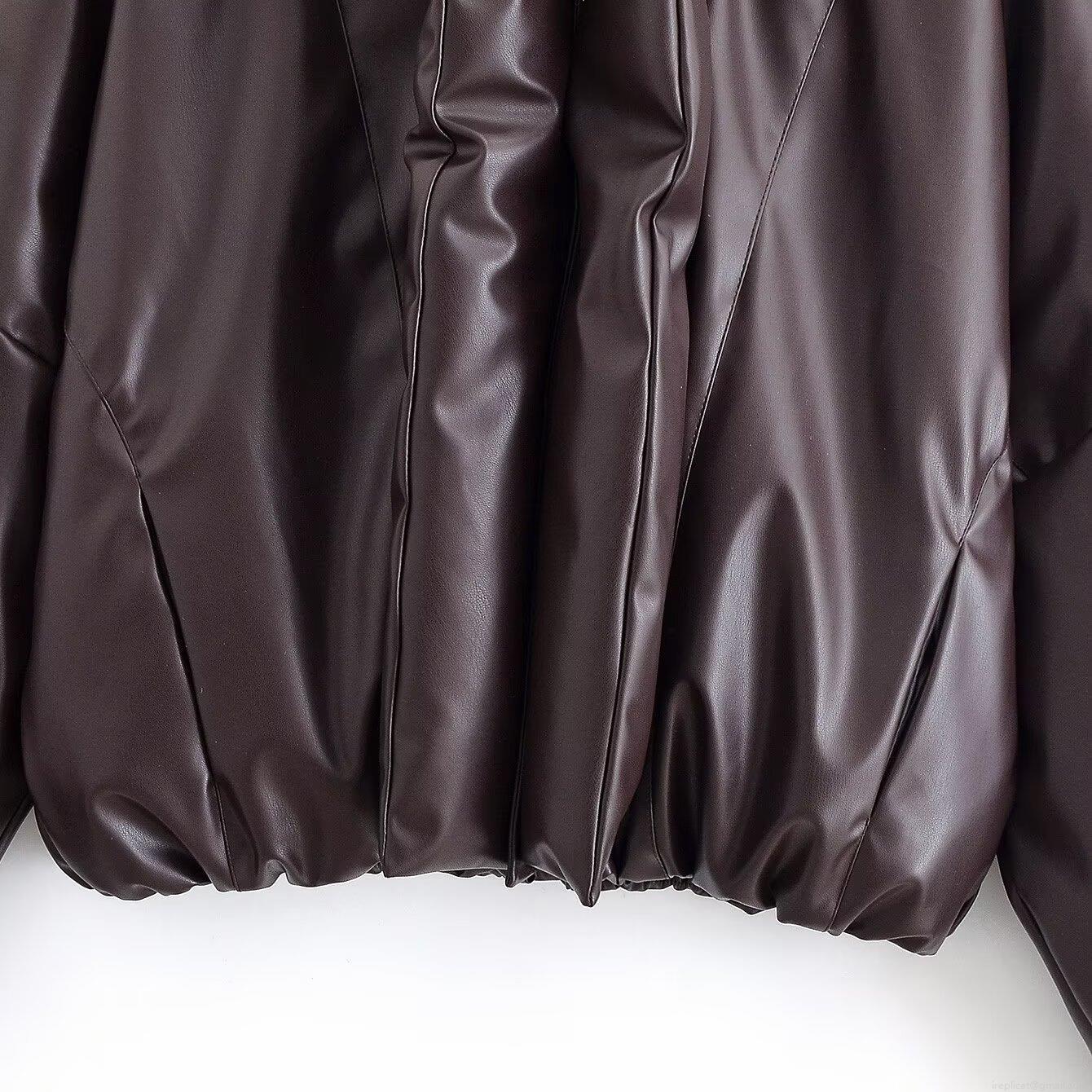 • Women's Faux Leather Padded Jacket 100% Polyester Lining Zipper Up Lapel Collar Oversized Winter Warm Casual Streetwear Solid Color Jacket With Pockets