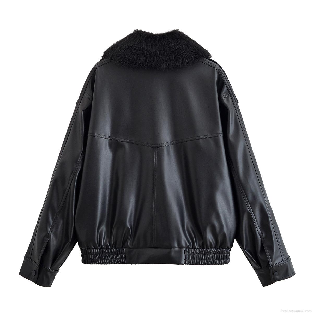 Women's Faux Leather PU Jacket With Detachable Faux Fur Collar Loose Solid Color Baseball Bomber Coat Casual Streetwear Warm Outerwear For Women