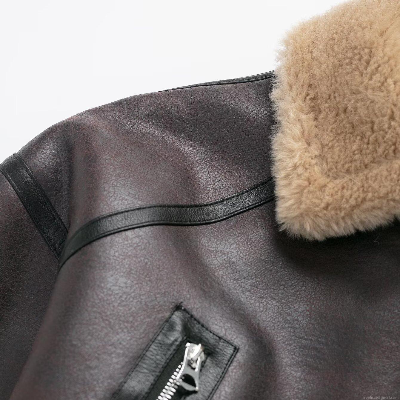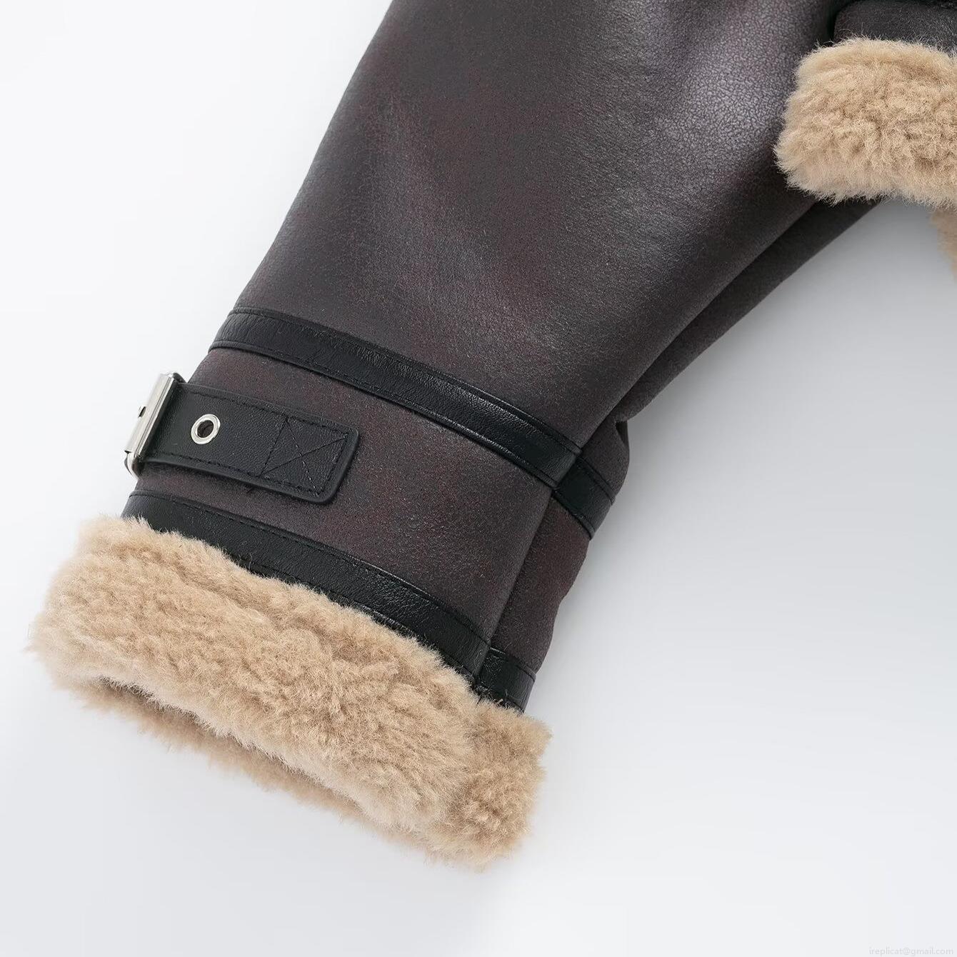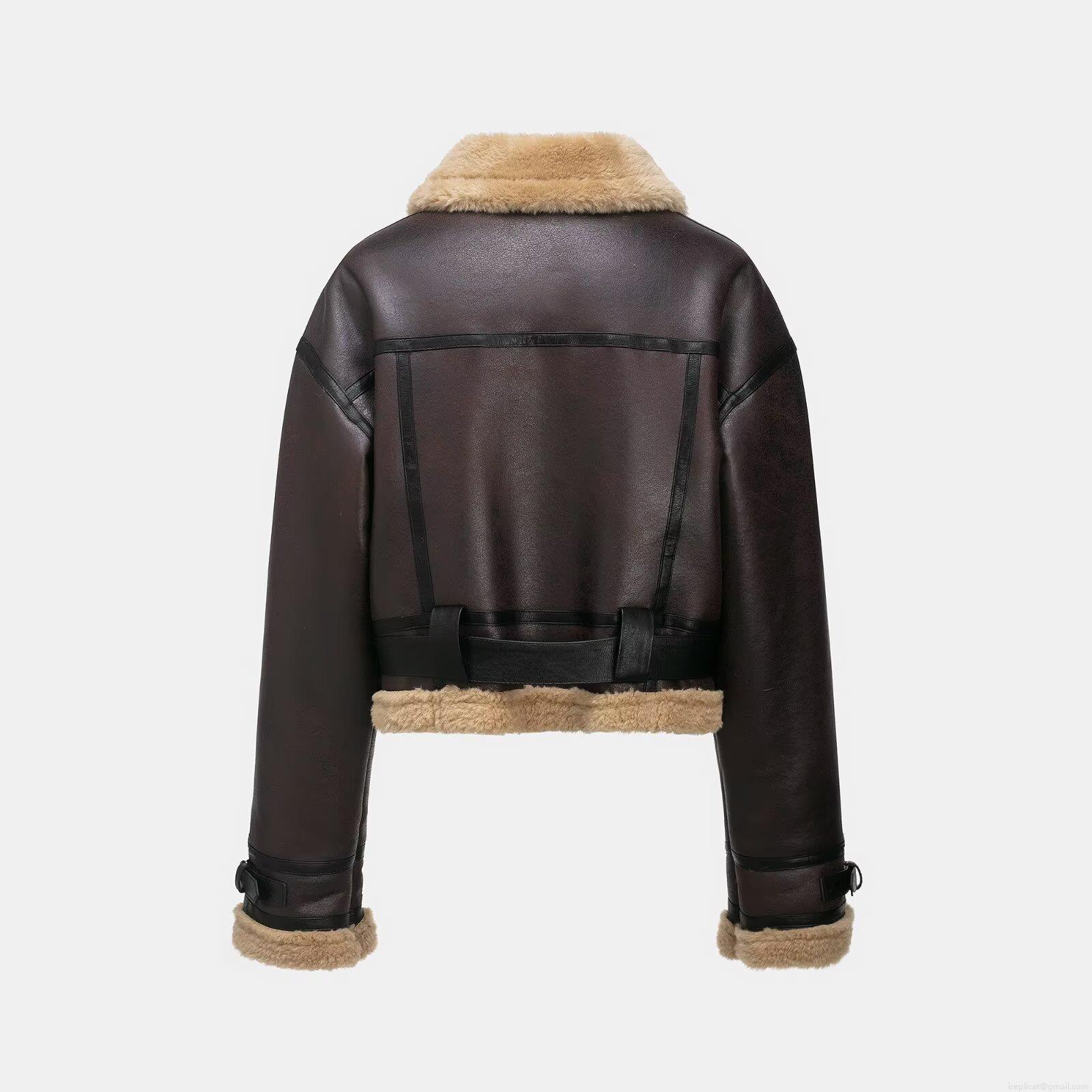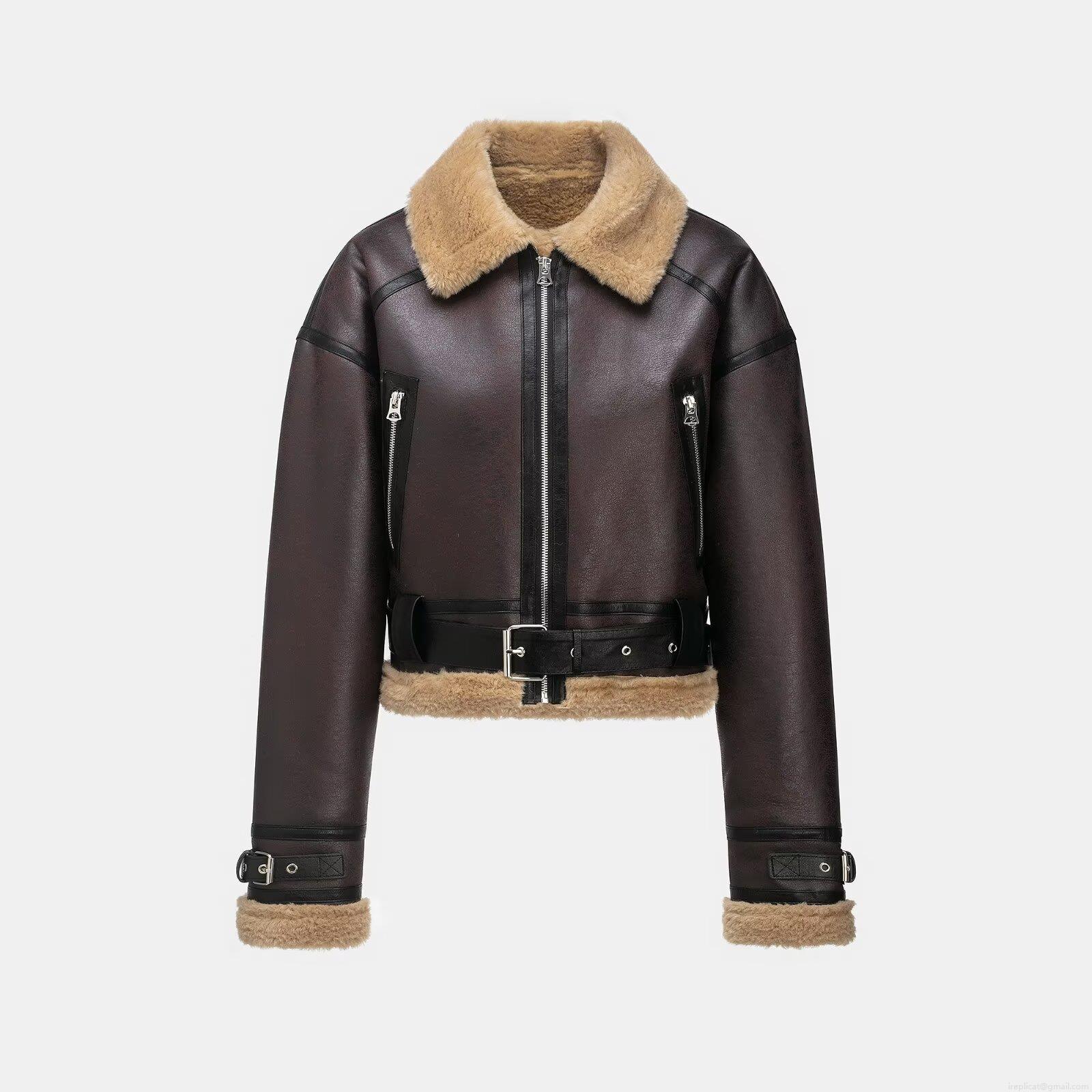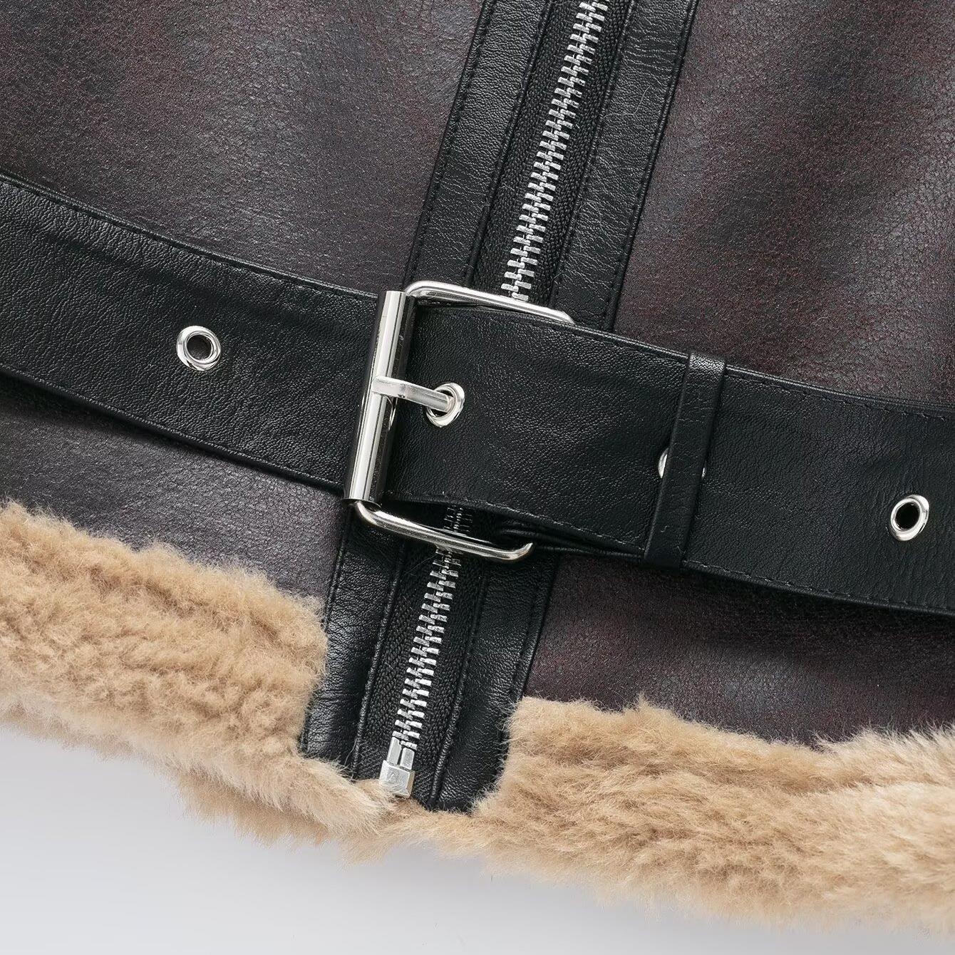 • Women's Faux Leather Shearling Aviator Jacket Warm Fleece Lined Moto Coat With Waistbelt Lapel Zip Up Short Outwear For Winter Casual Ladies
