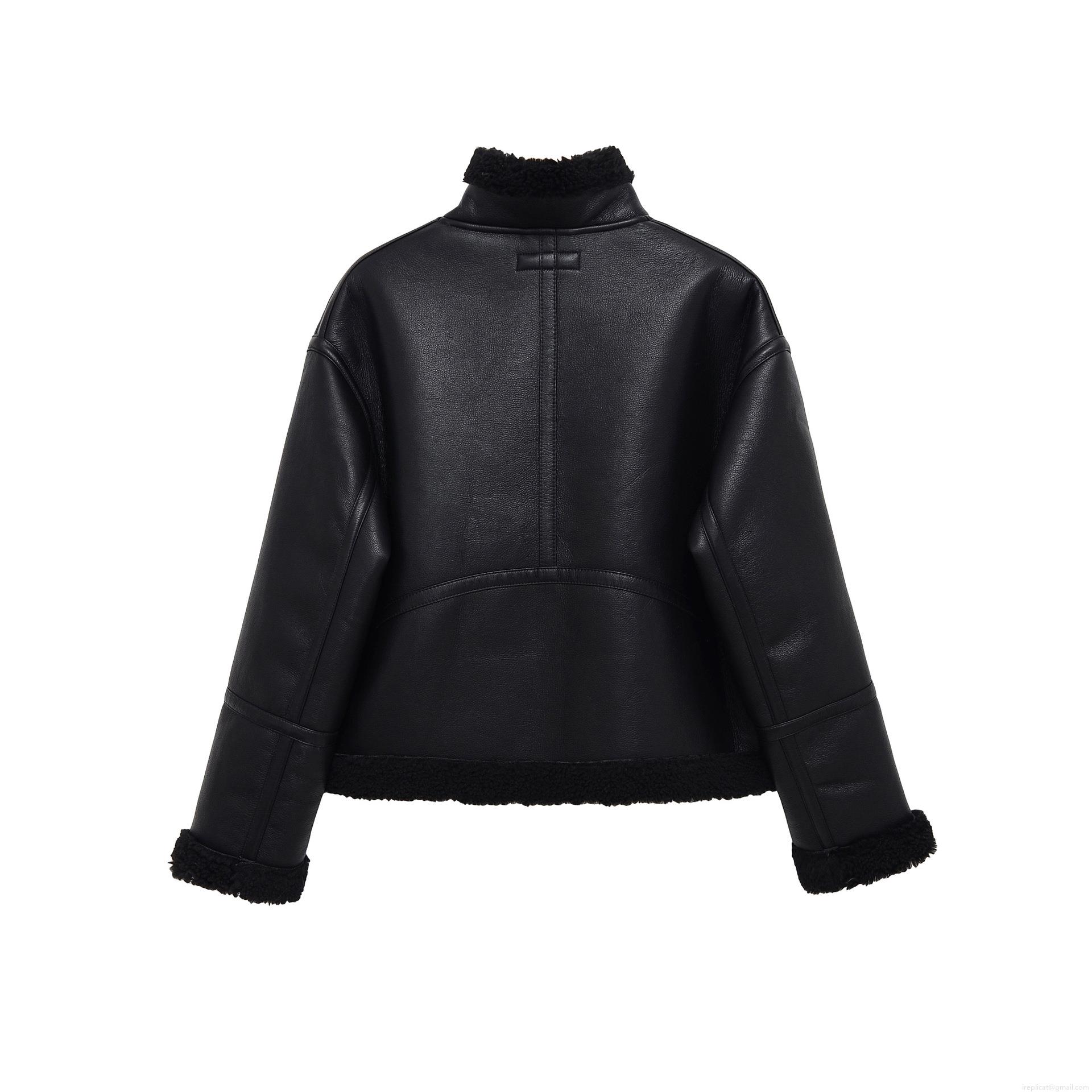 • Women's Faux Leather Shearling Integrated Jacket Warm Sherpa Lined Biker Coat With Stand Collar Long Sleeve Spliced Winter Streetwear Outerwear