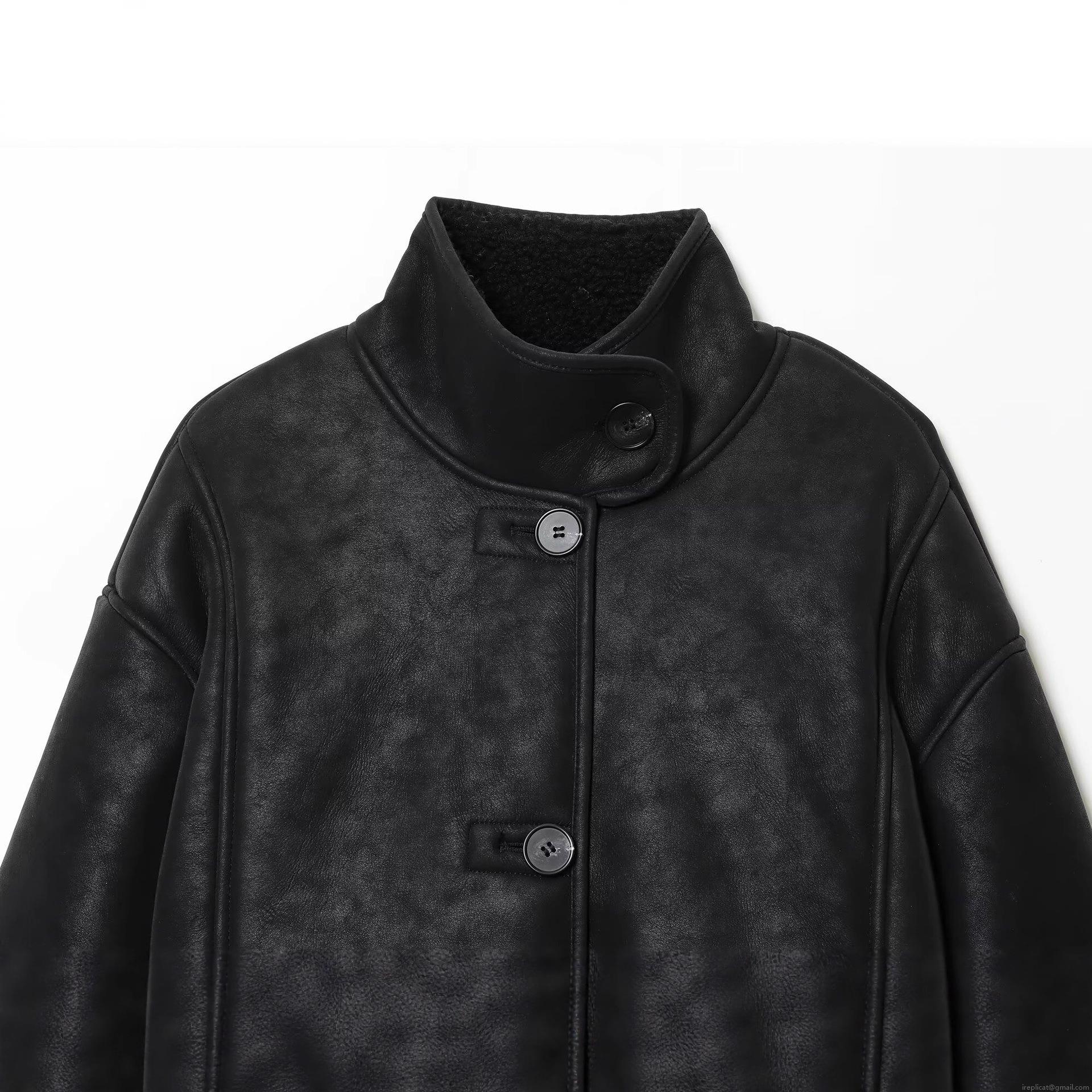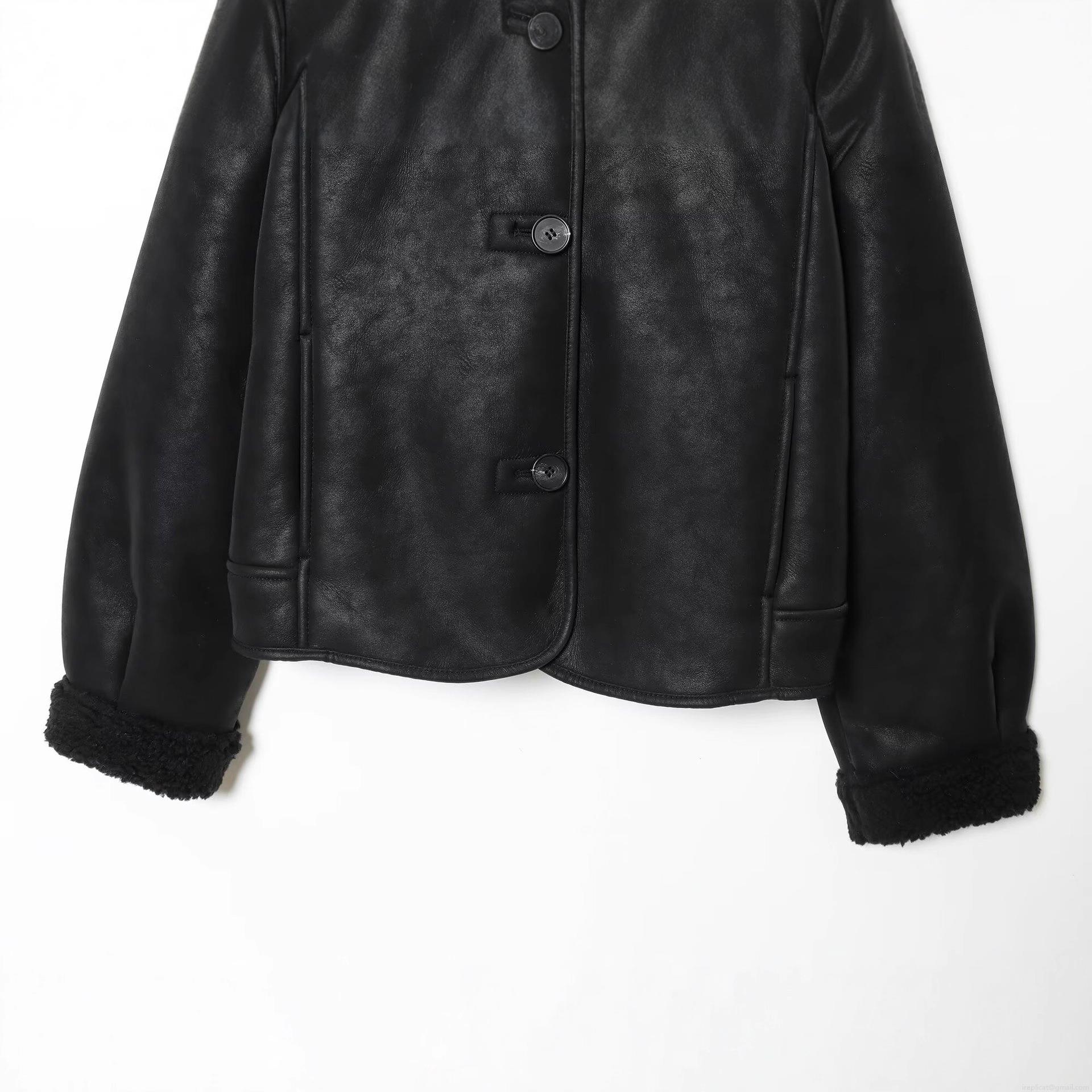 • Women's Faux Leather Shearling Jacket Stand Collar Single Breasted Short Coat Autumn Winter Streetwear Outerwear Pocket Detail Black