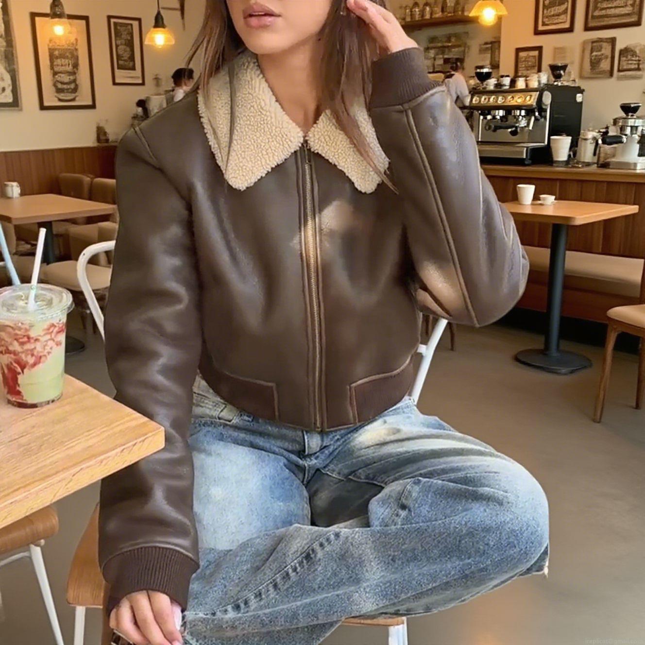 • Women's Faux Leather Shearling Jacket Vintage Brown Faux Fur Collar Pilot Biker Jacket Short Warm Windproof Winter Outwear For Women