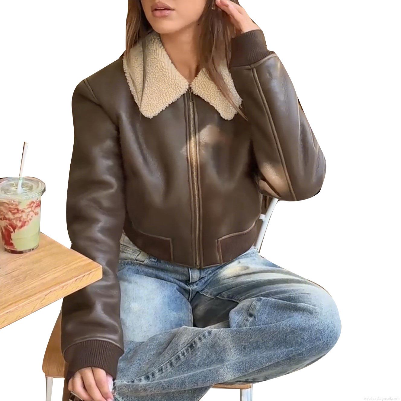 Women's Faux Leather Shearling Jacket Vintage Brown Faux Fur Collar Pilot Biker Jacket Short Warm Windproof Winter Outwear For Women