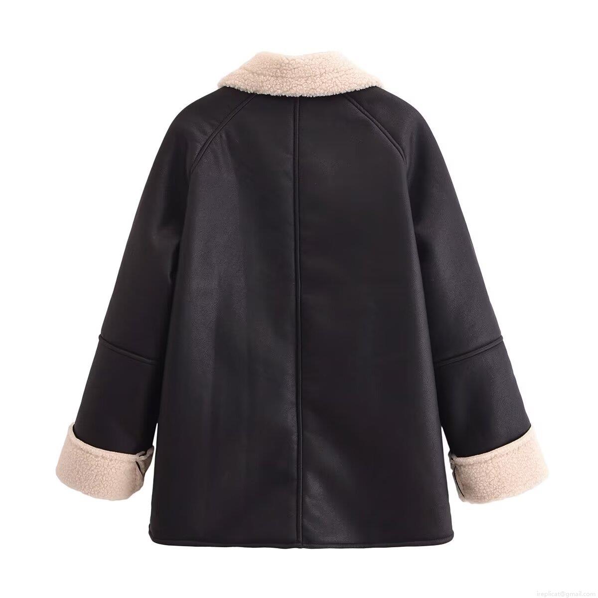 Women's Faux Leather Shearling Jacket Warm Patchwork Lapel Long Sleeve Solid Color Single Breasted Coat Autumn Winter Streetwear Outerwear
