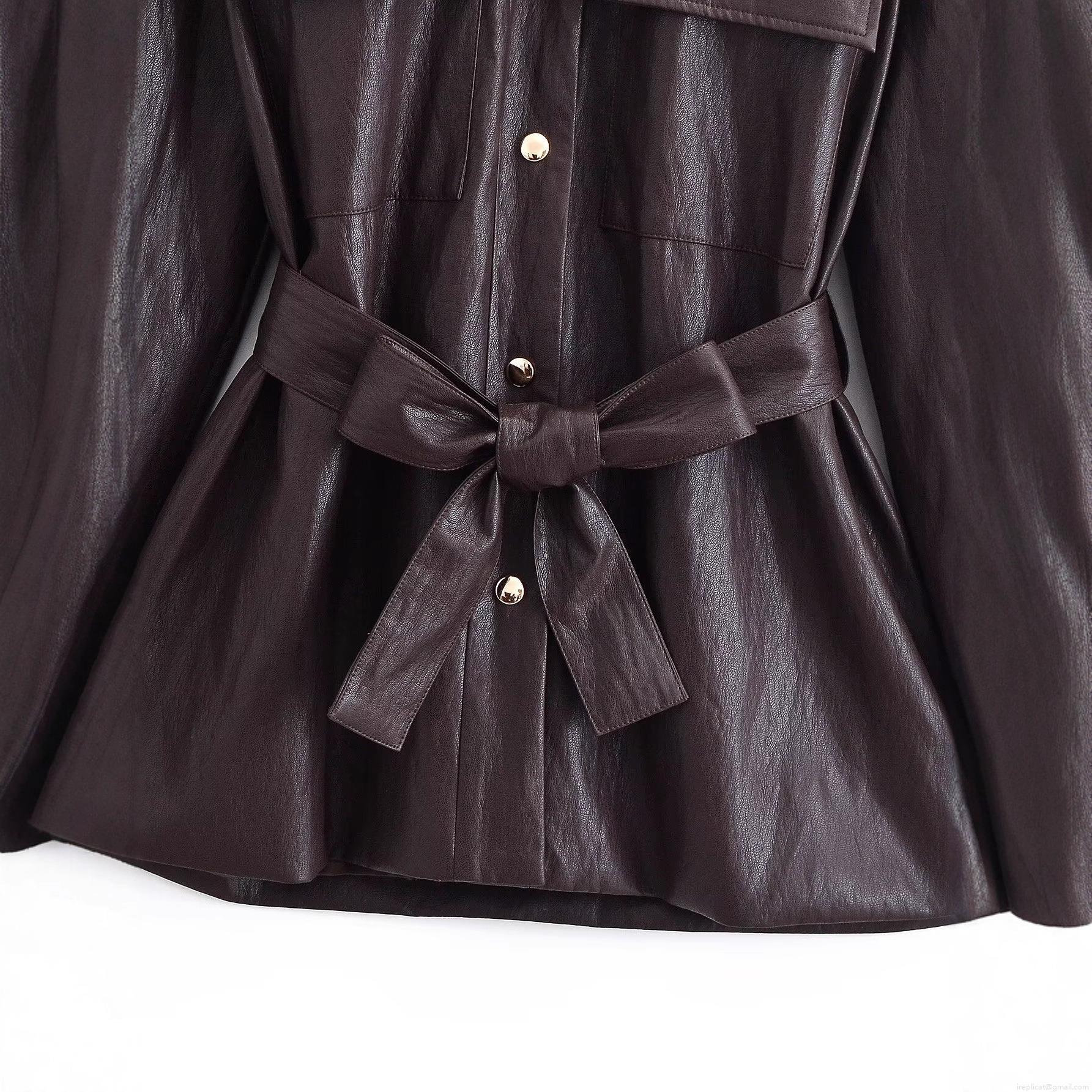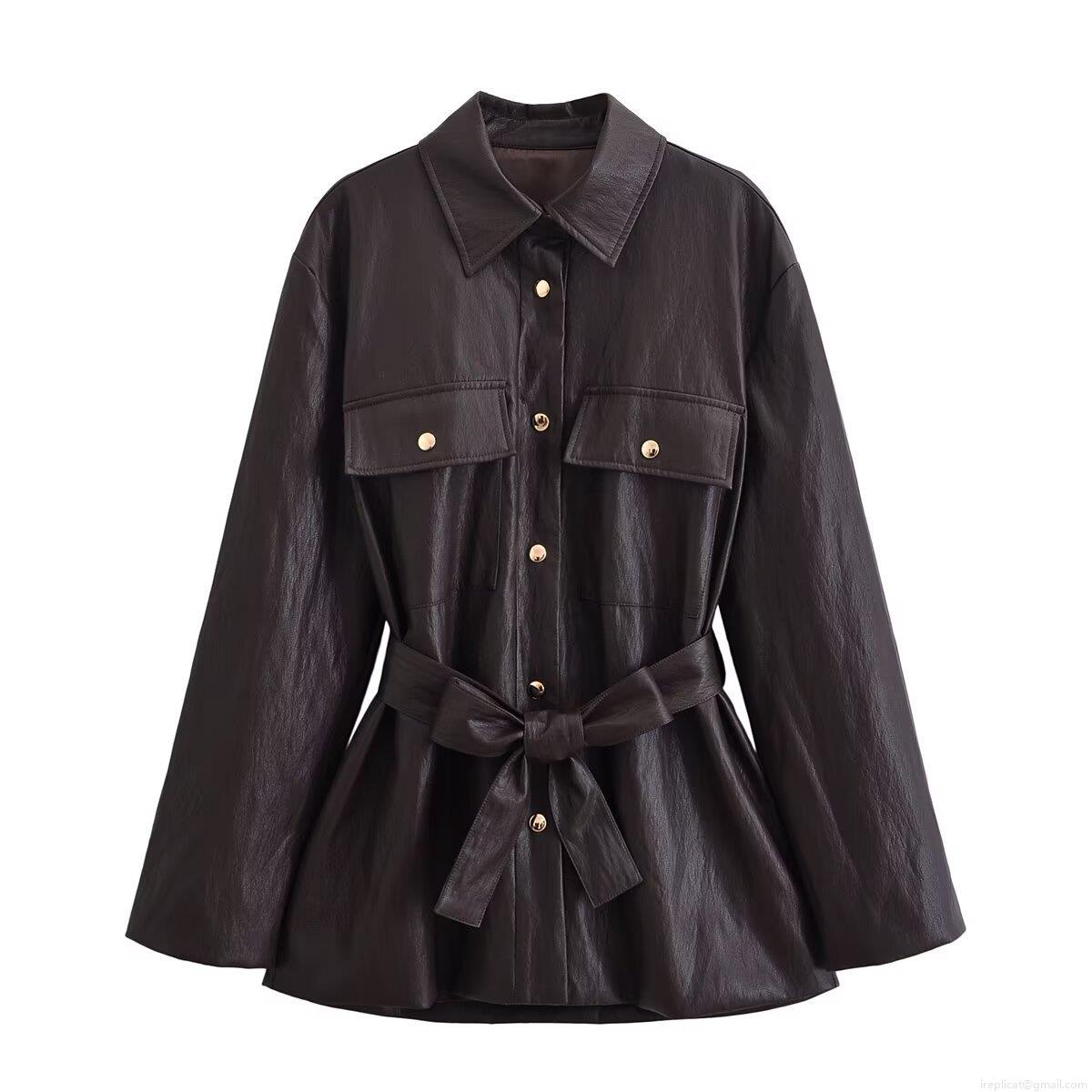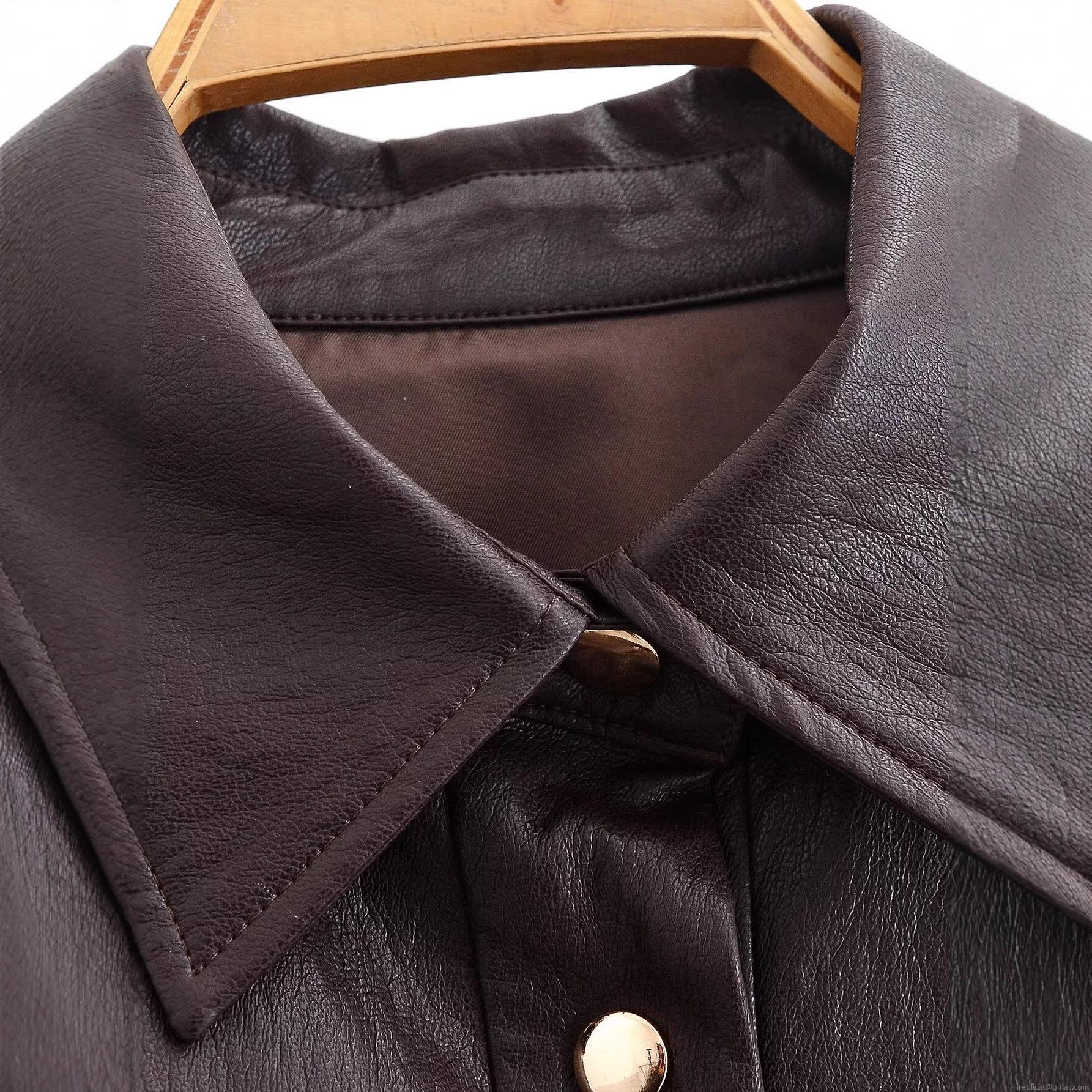 Women's Faux Leather Shirt Jacket Elegant PU Leather Mid-Length Trench Coat With Belt Gold Buttons Long Sleeve Lapel Windbreaker Outwear For Lady