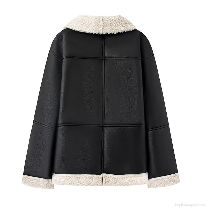 Women's Faux Leather Spliced Lamb Wool Jacket Contrast Black White Zip Up Warm Winter Outerwear Streetwear Casual Lapel Coat