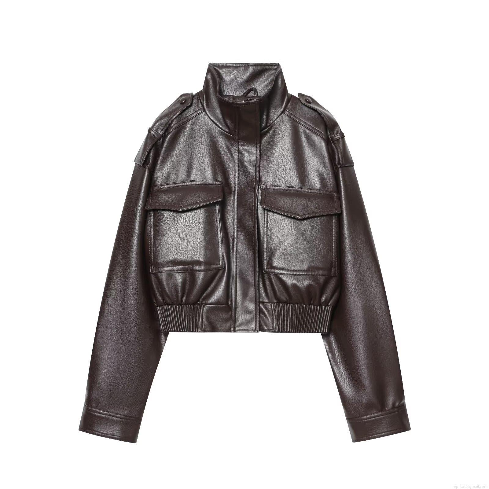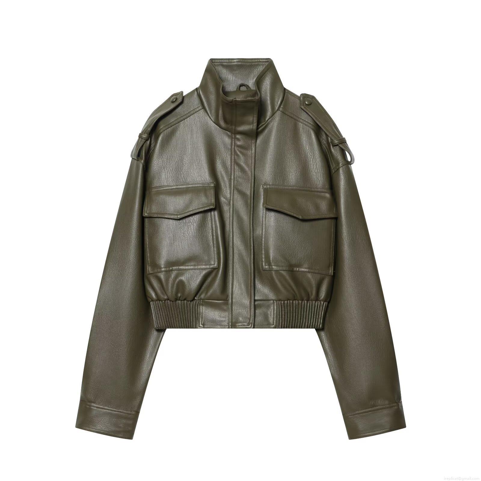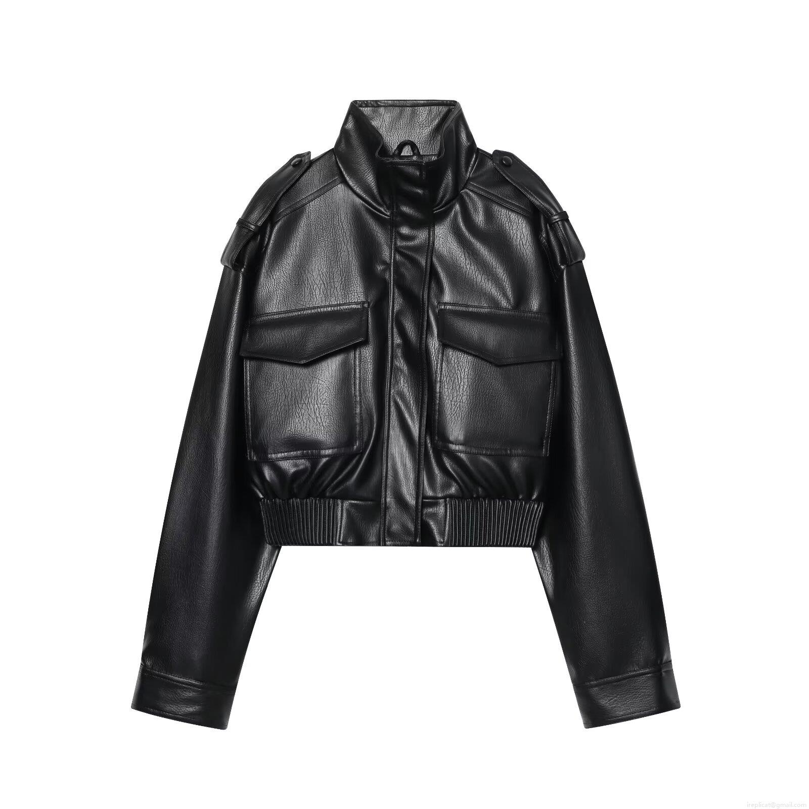 • Women's Faux PU Leather Jacket Stand Collar Cargo Bomber Coat With Big Pockets Epaulettes Loose Fit Short Streetwear Outerwear For Autumn Winter