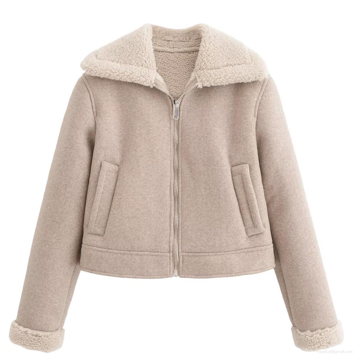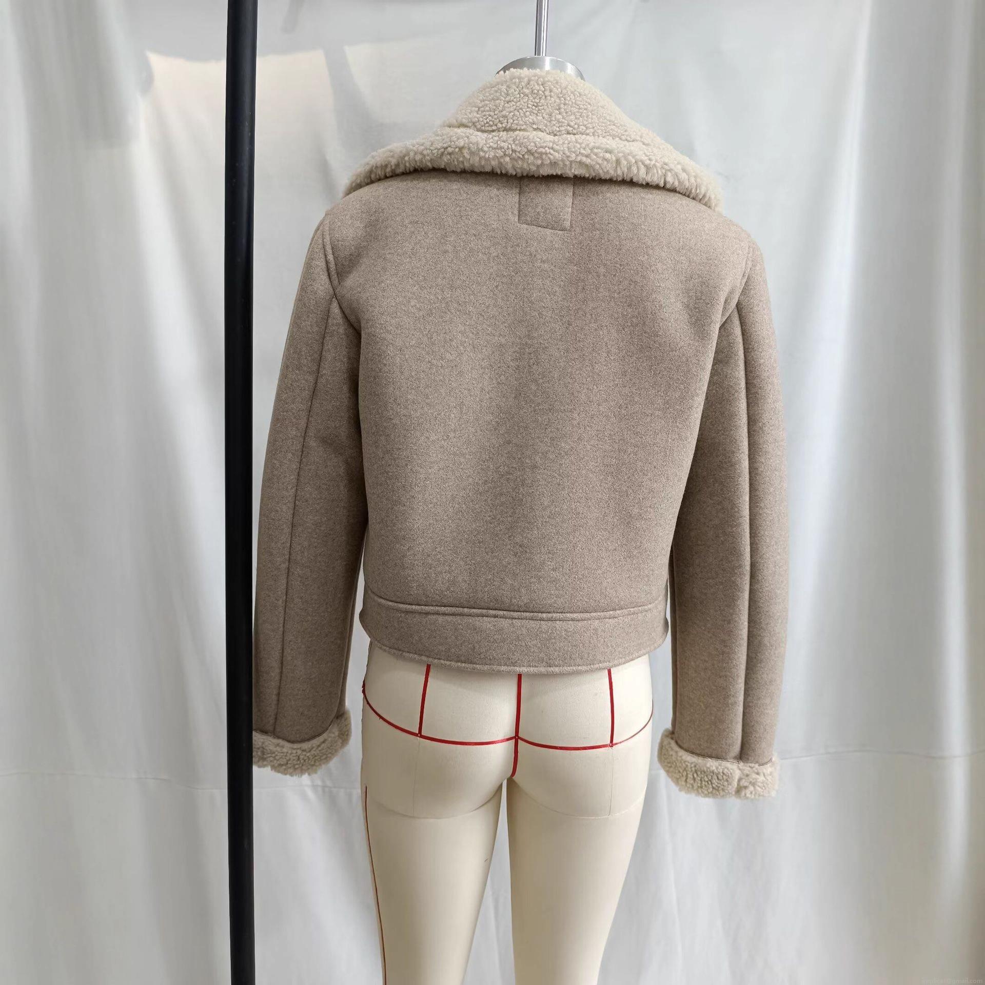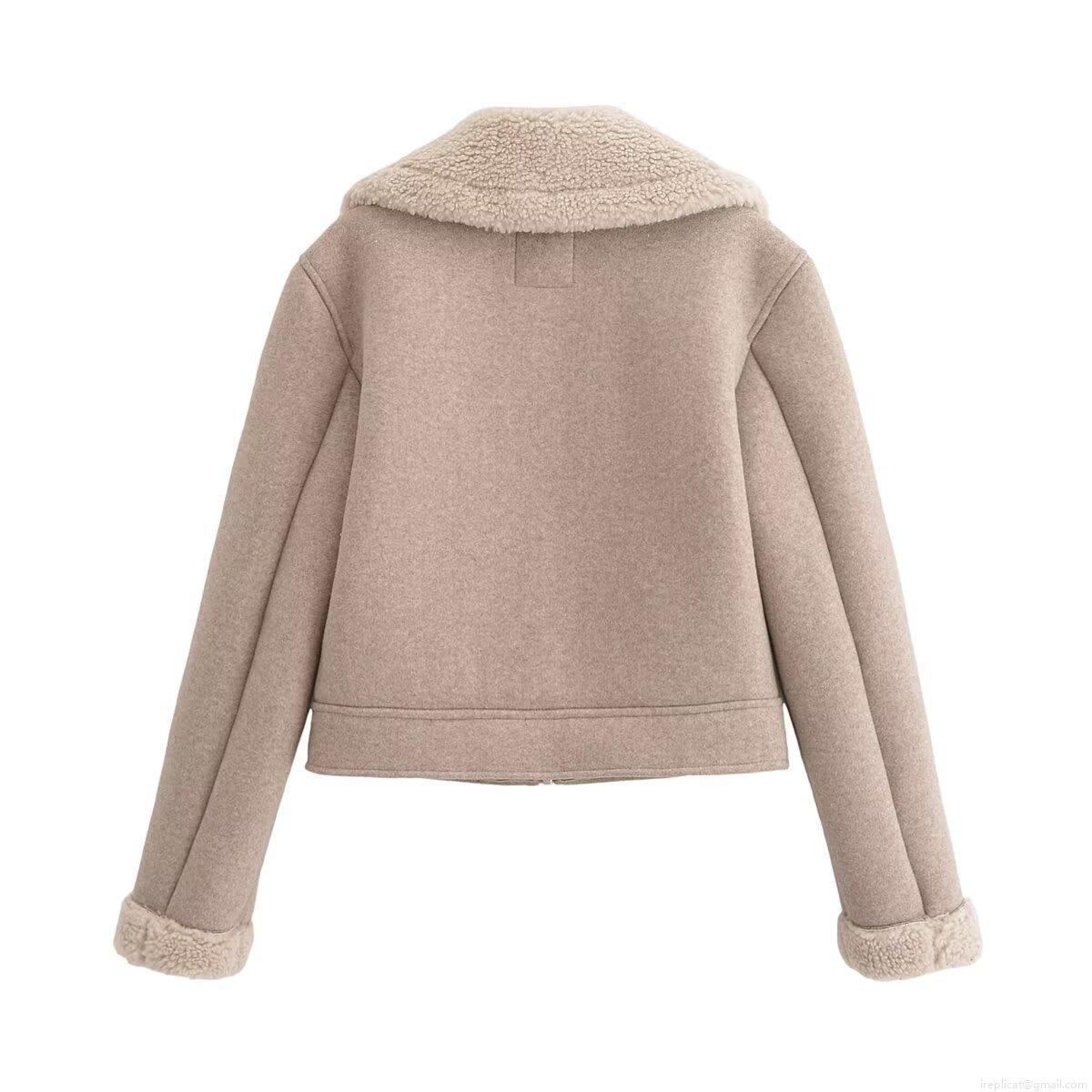 Solid Color, Metal Zipper, Pocket Decoration, Large Lapel, Lambswool Patchwork
