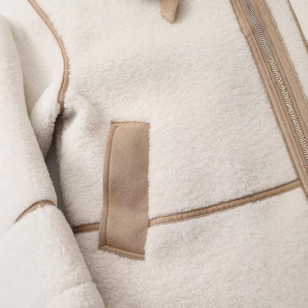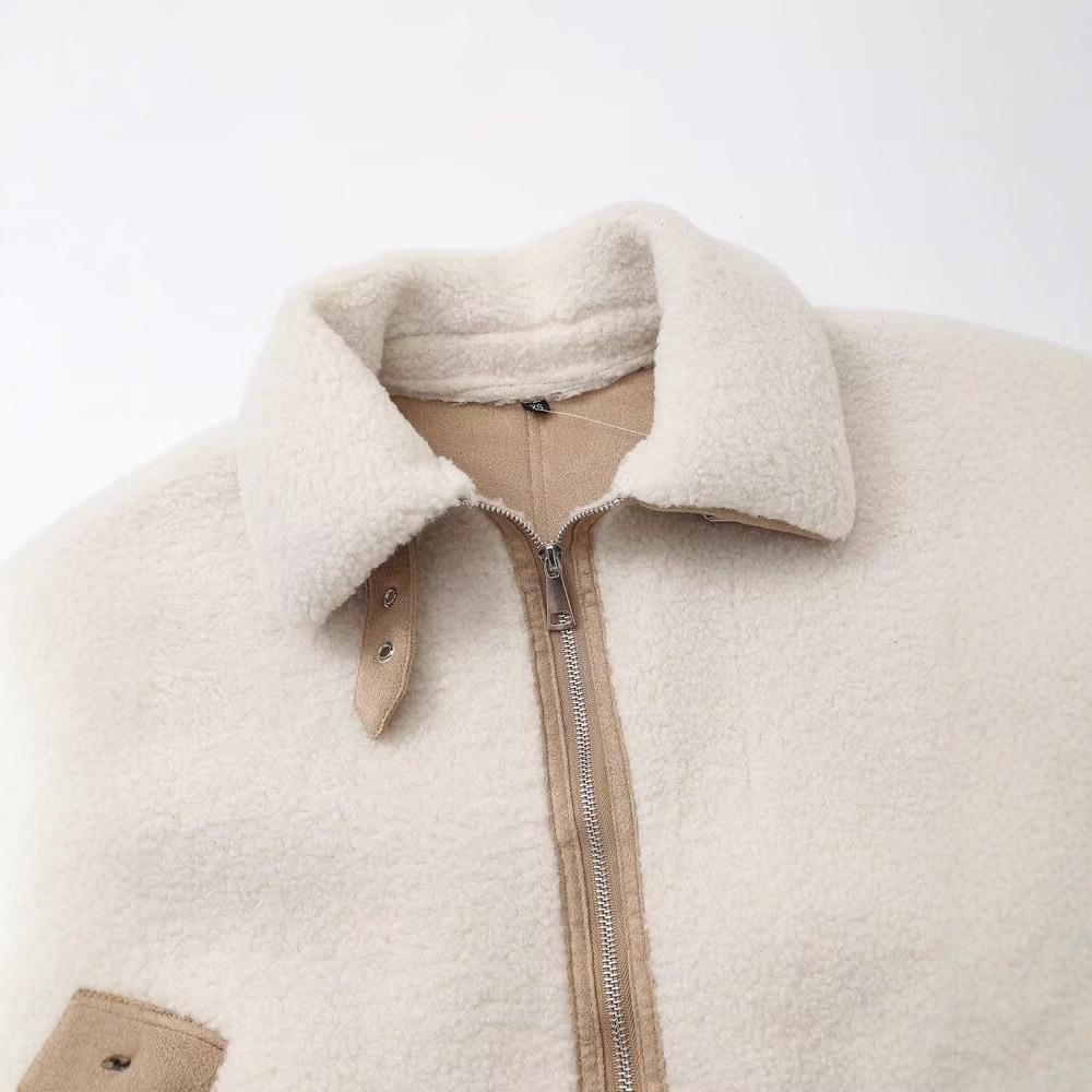 • Women's Faux Shearling Jacket Lapel Long Sleeve Contrast Binding Zipper Patchwork Coat Streetwear Casual Warm Winter Outwear For Ladies
