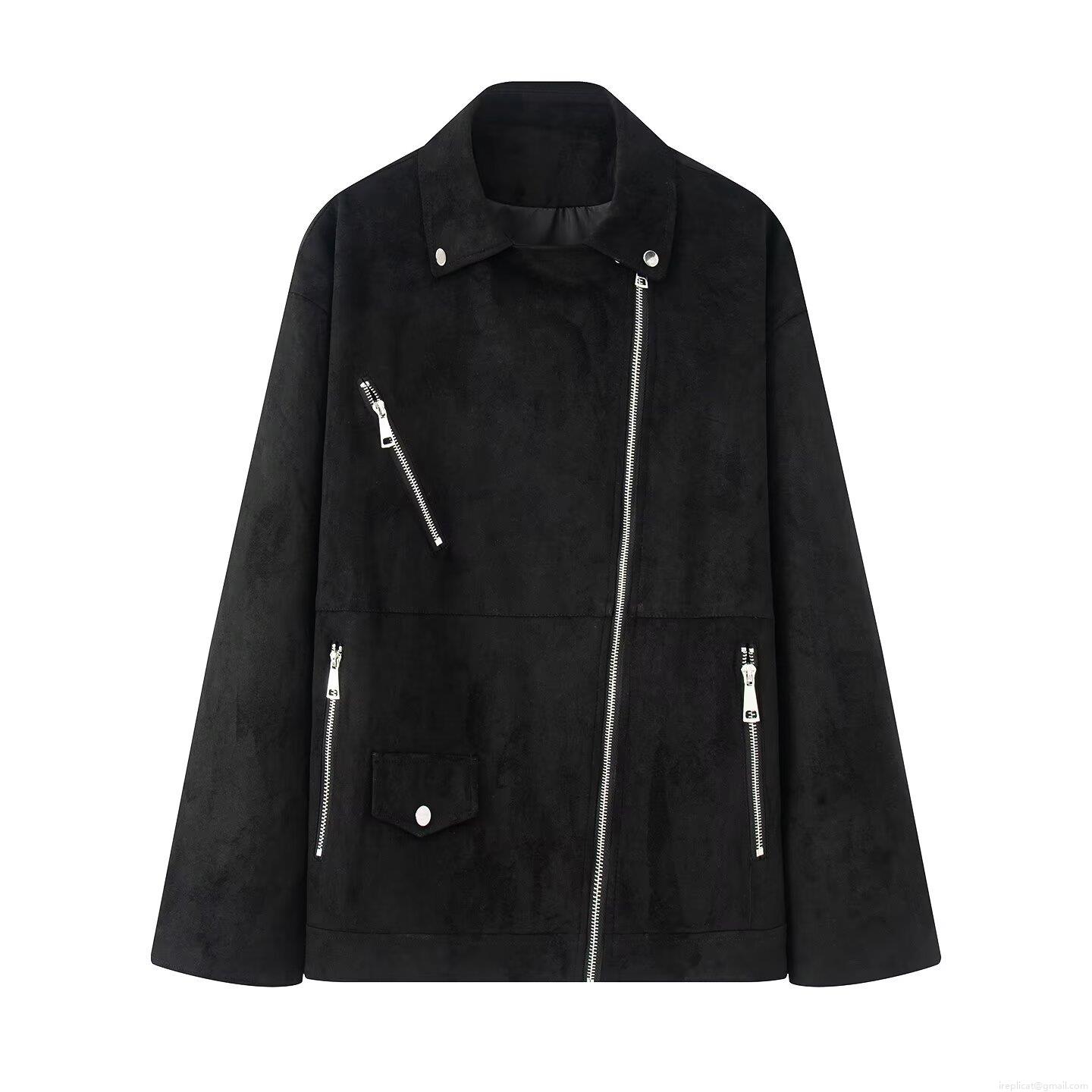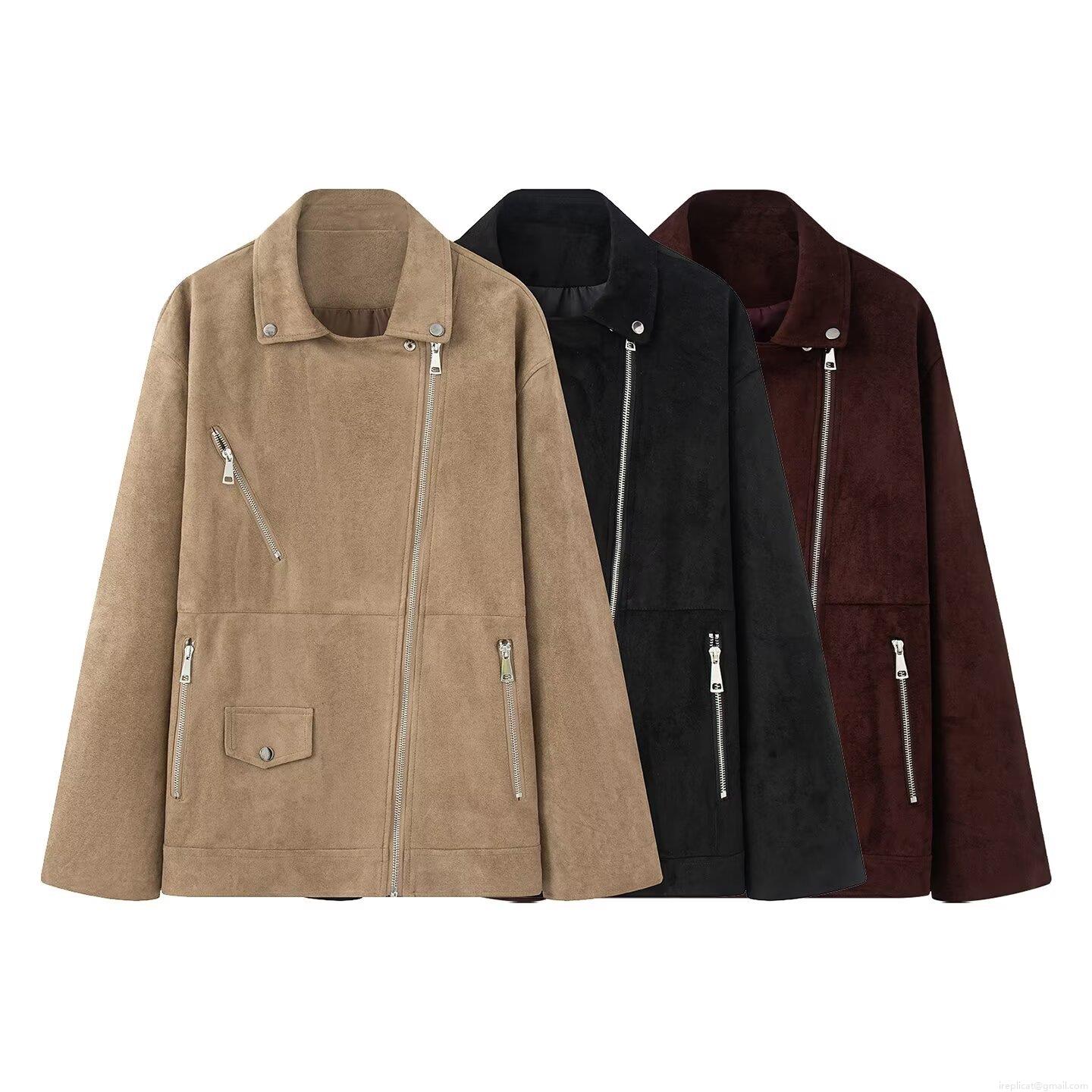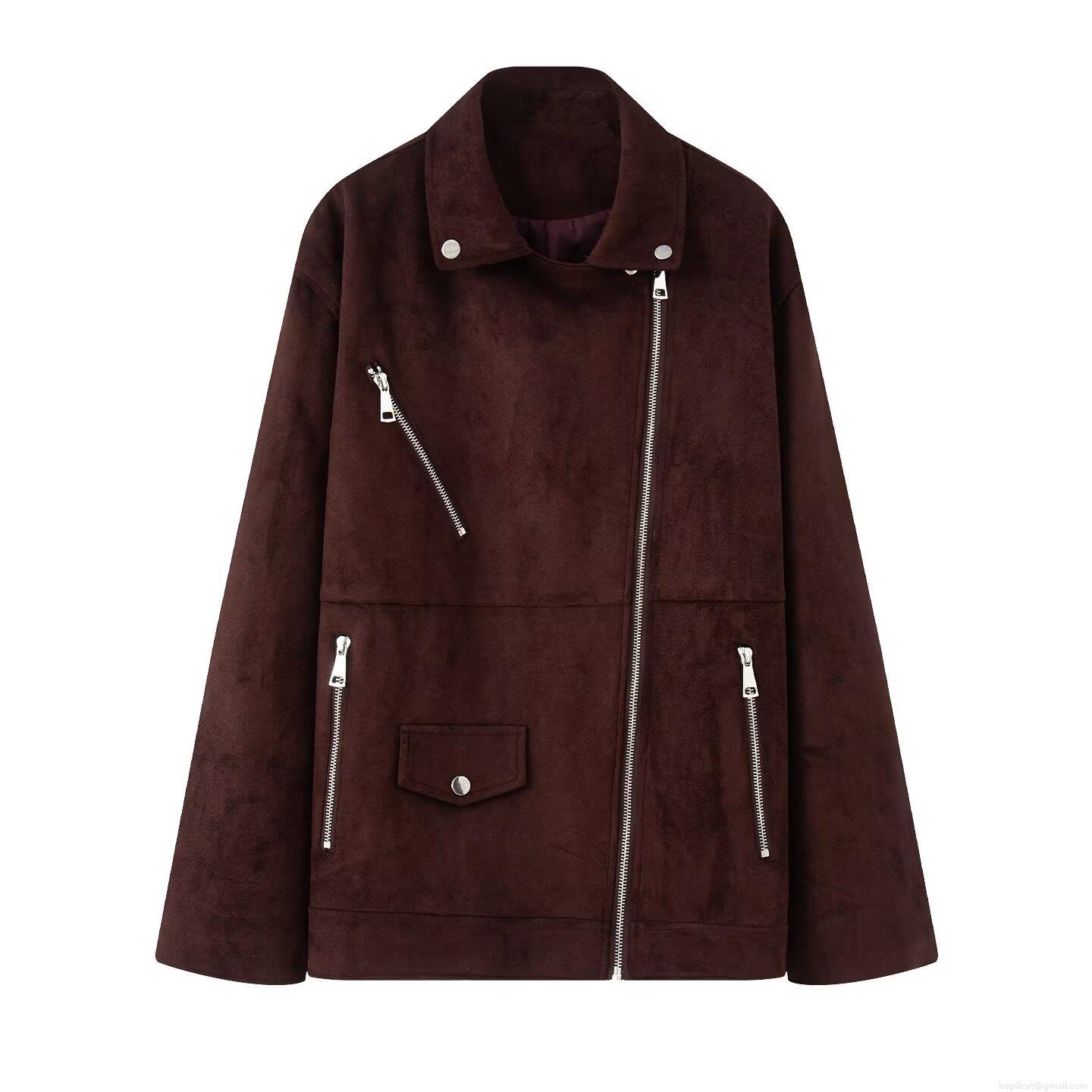 • Women's Faux Suede Biker Jacket Retro Lapel Zippered Outwear Casual Streetwear Loose Fit Solid Color Coat for Ladies