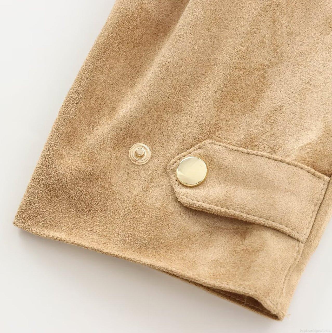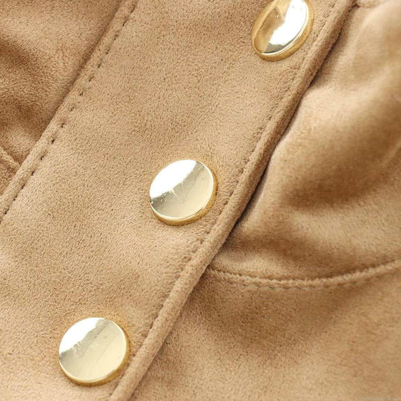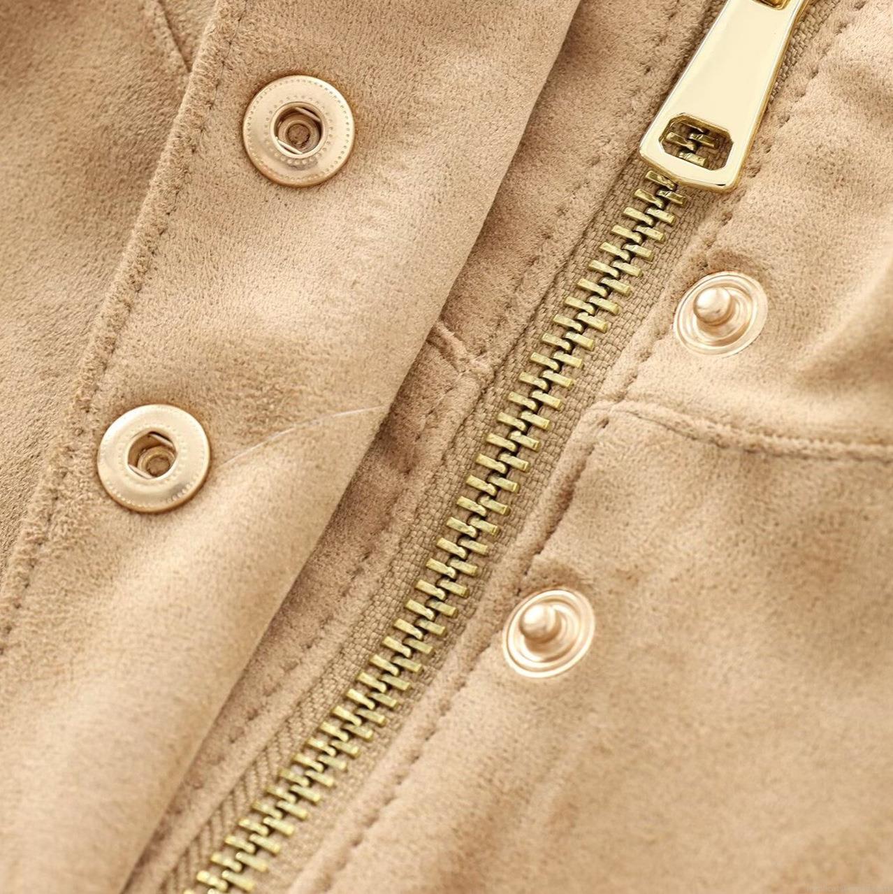 • Women's Faux Suede Biker Jacket Stand Collar Gold Button Zip Up Short Coat Streetwear Spicy Style Autumn Winter Wheat Color Outerwear For Women