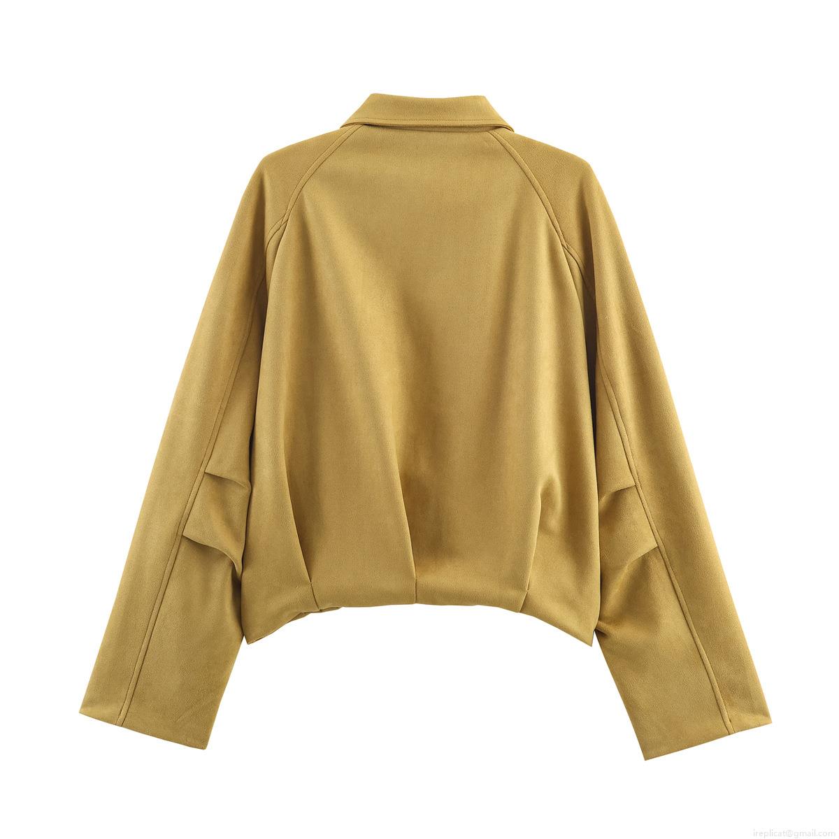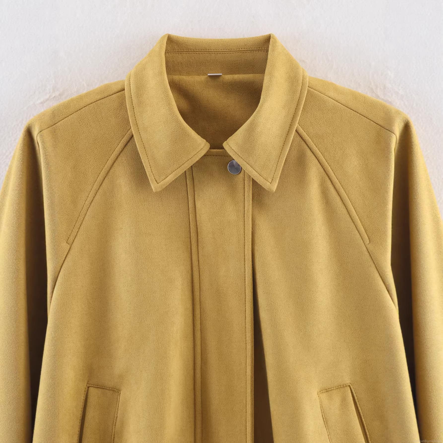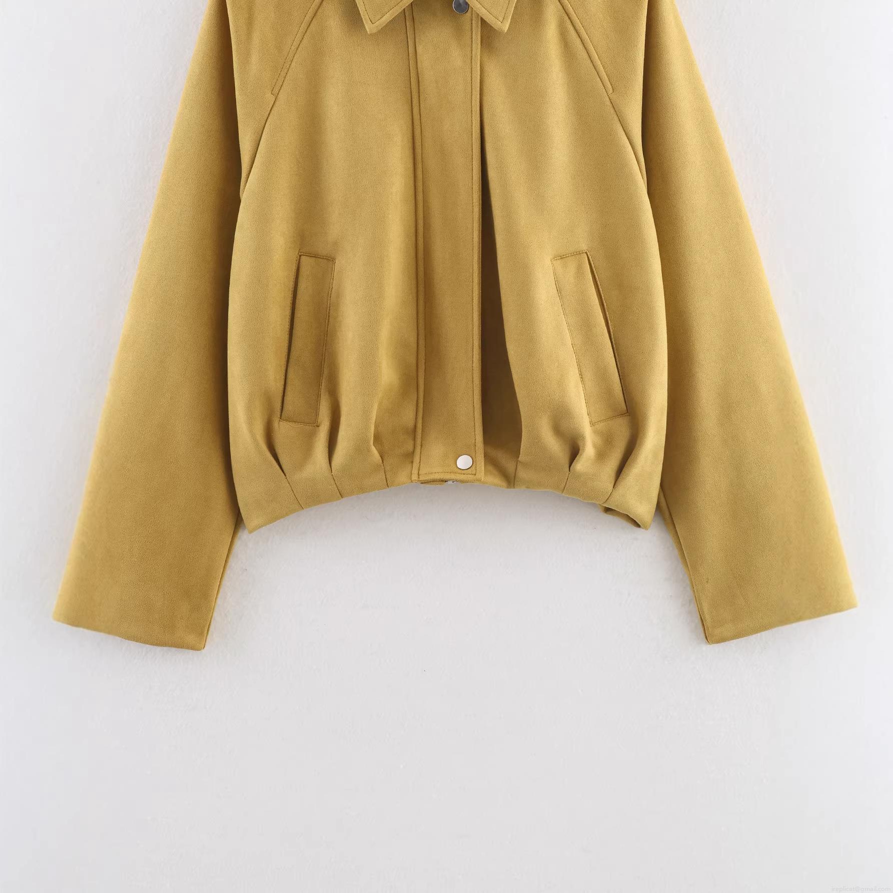 • Women's Faux Suede Bomber Jacket Mustard Yellow Long Sleeve Lapel Zip Up Short Outerwear Solid Color Loose Fit Casual Coat with Pockets for Ladies Streetwear