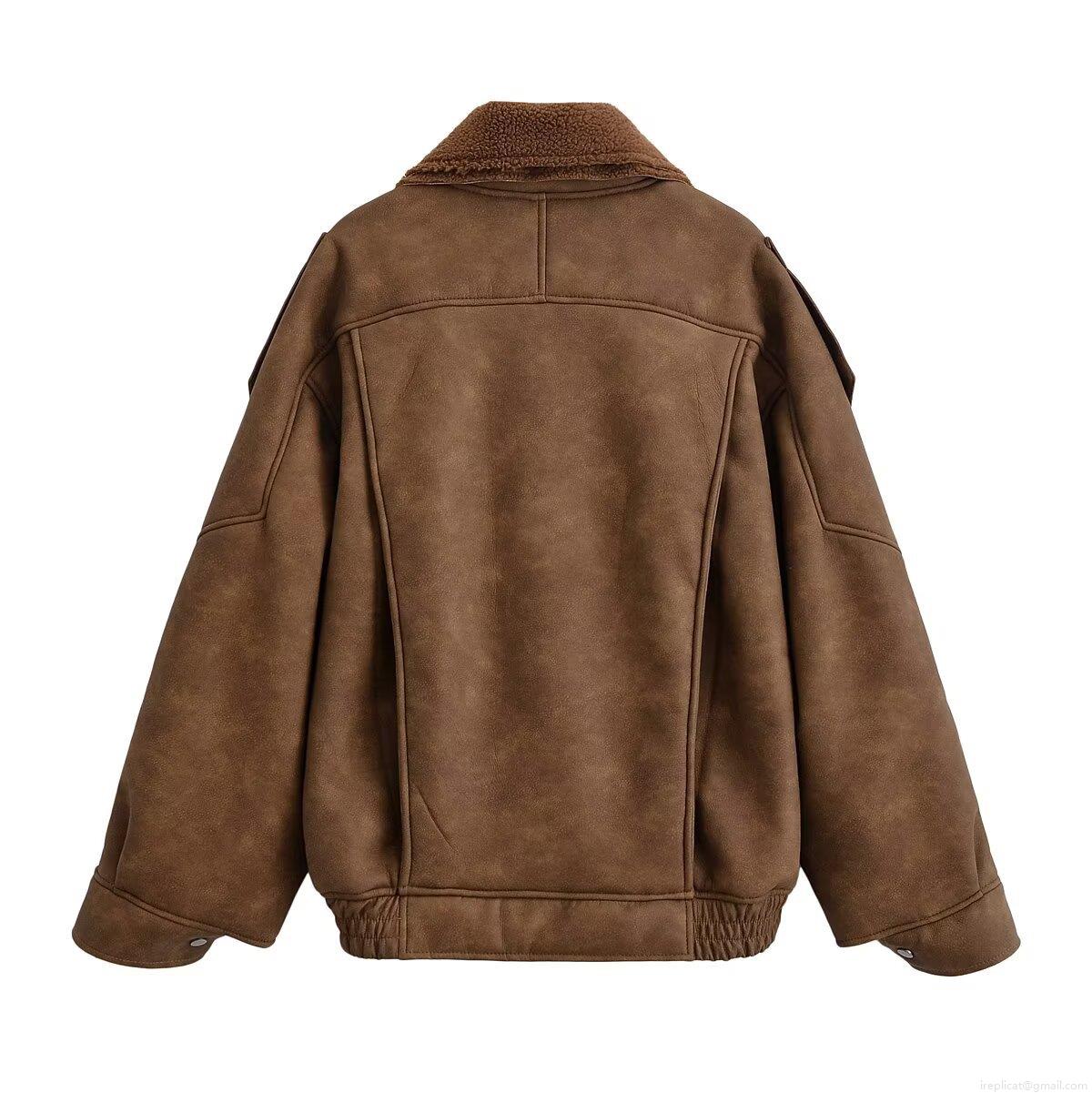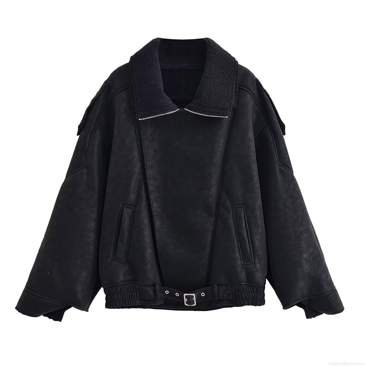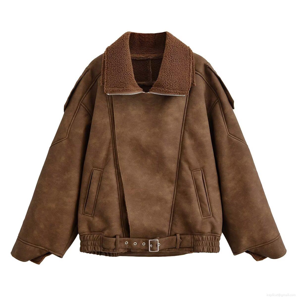 Women's Faux Suede Fleece Lined Jacket Lapel Long Sleeve Motorcycle Coat Autumn Winter Loose Outerwear With Belt Fashion Warm Jacket