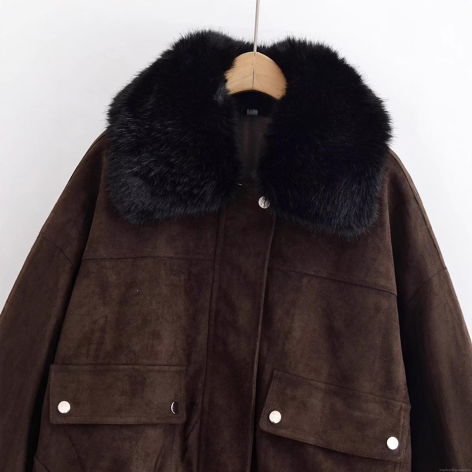 Women's Faux Suede Jacket Coat With Large Black Faux Fur Collar Loose Fit Street Style Polyester Outerwear With Flap Pockets And Metal Buttons For Winter Autumn