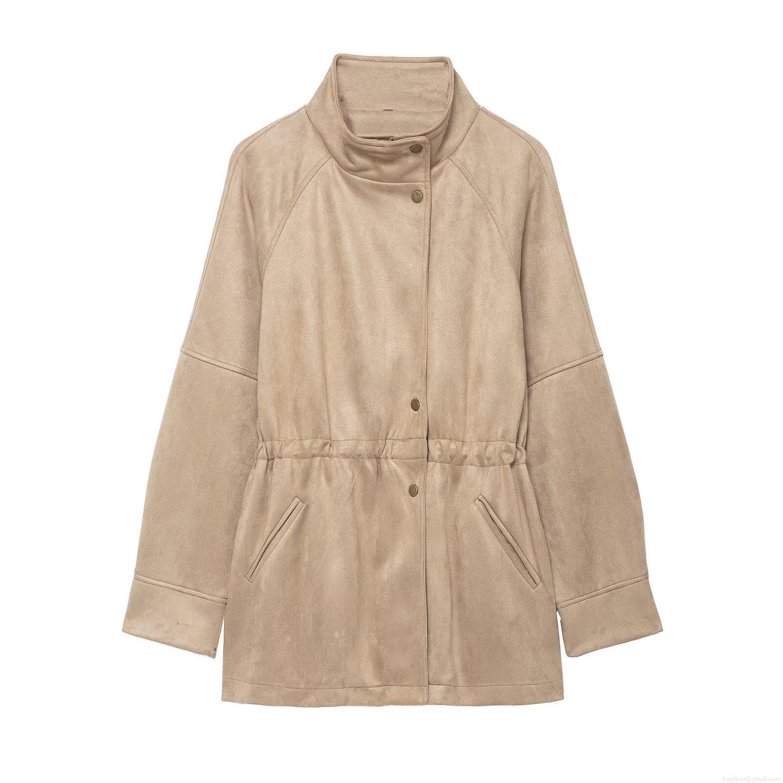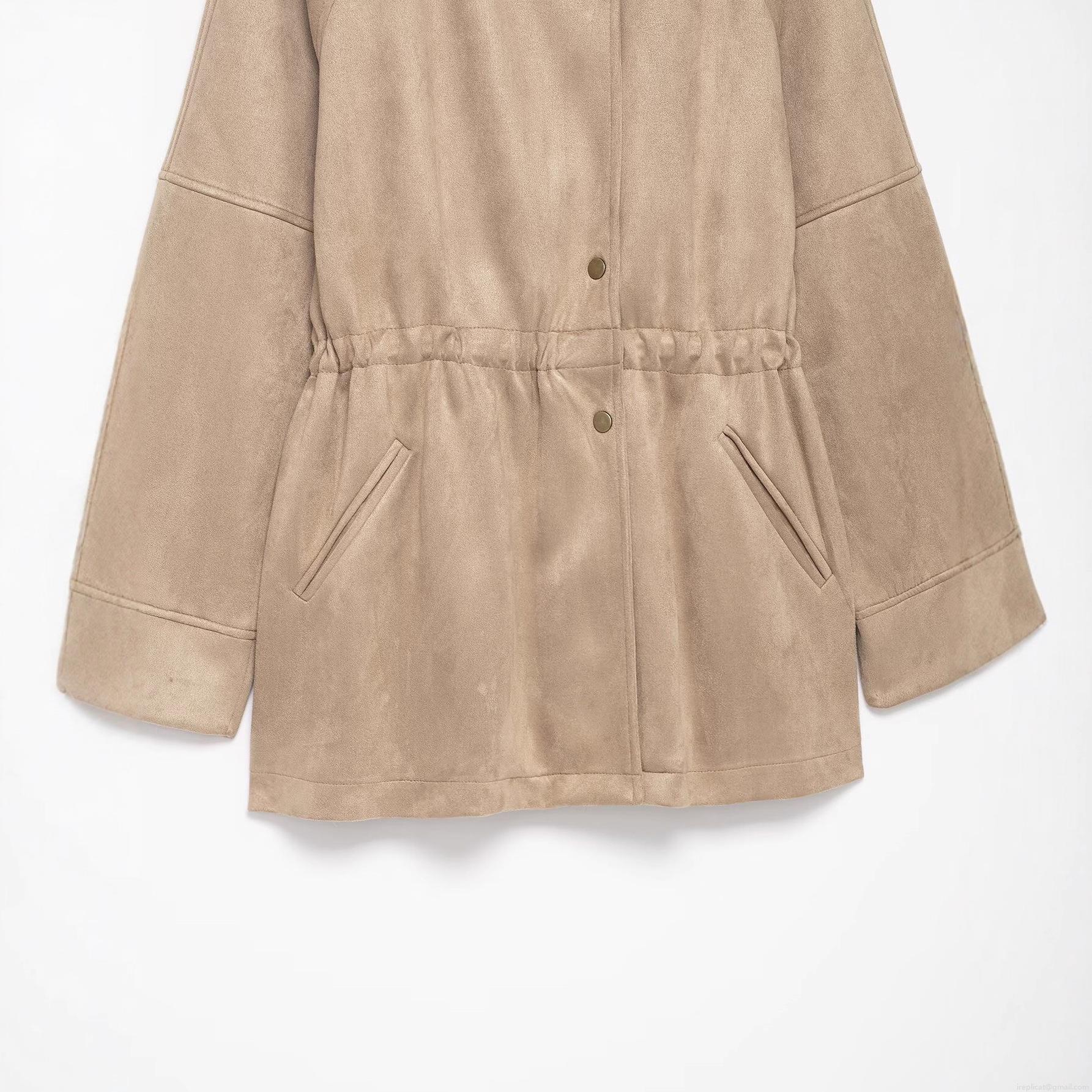 Women's Faux Suede Jacket Stand Collar Drawstring Waist Mid-Length Outerwear Solid Color Khaki Streetwear Coat For Autumn Winter Fashion