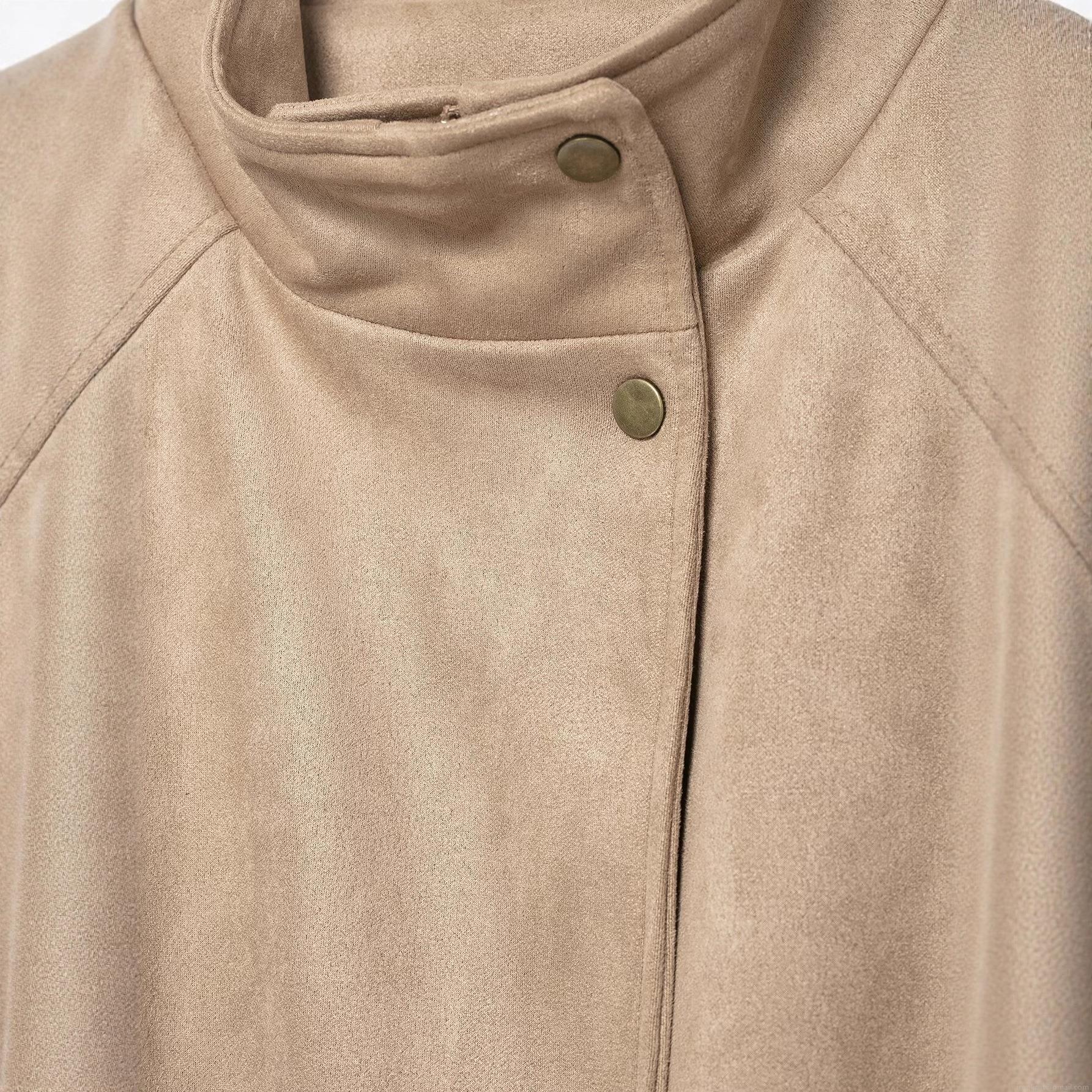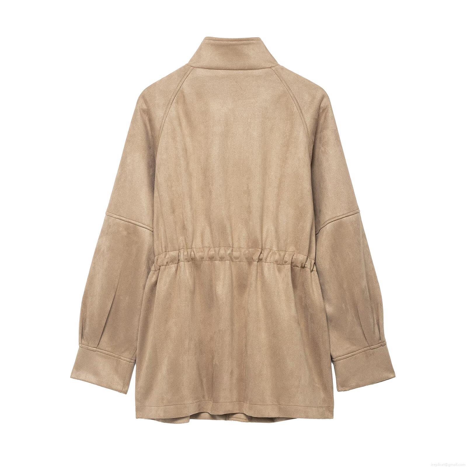 • Women's Faux Suede Jacket Stand Collar Drawstring Waist Mid-Length Outerwear Solid Color Khaki Streetwear Coat For Autumn Winter Fashion