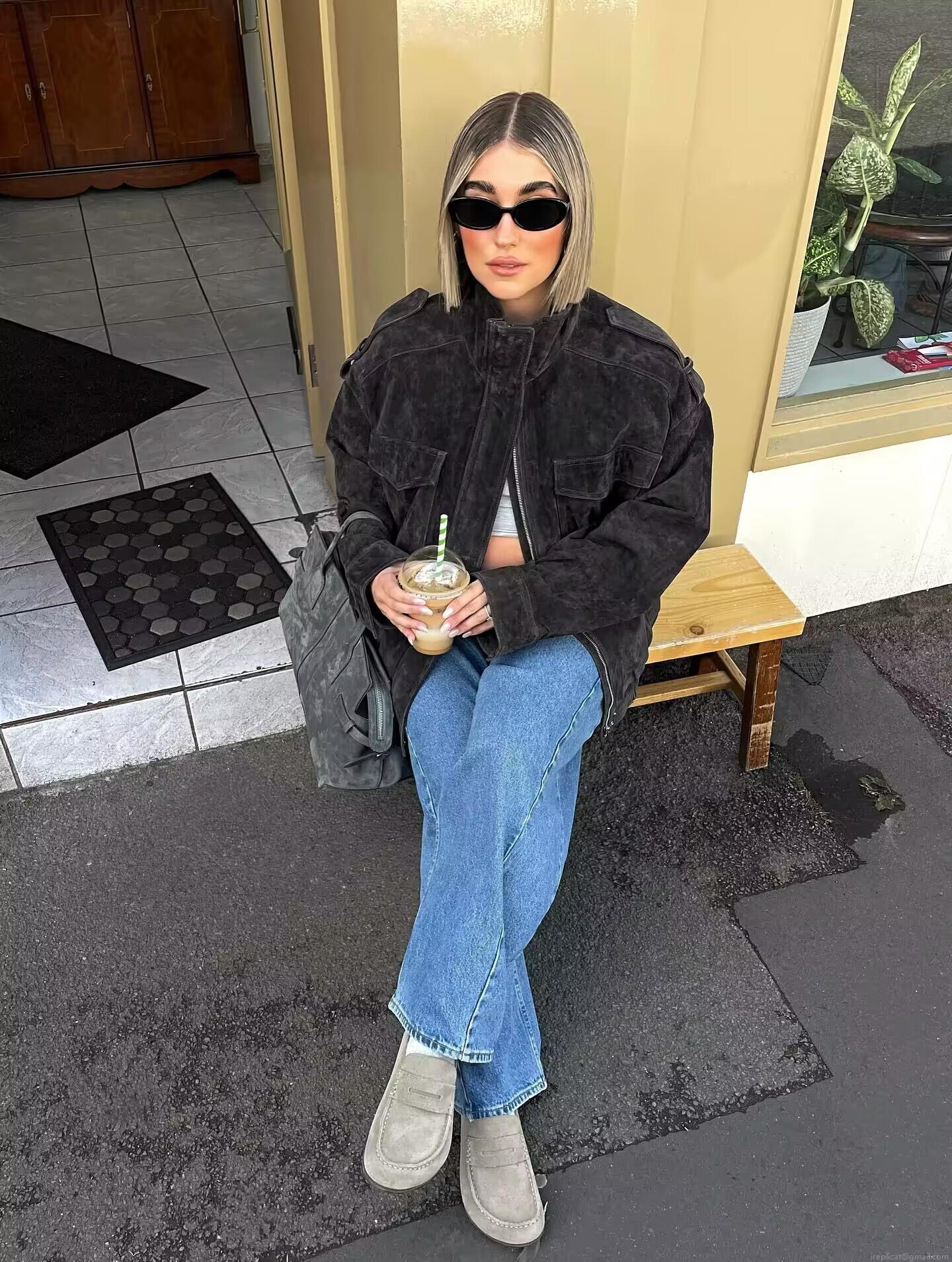 • Women's Faux Suede Jacket Stand Collar Loose Fit Utility Outerwear Coat With Pockets Long Sleeve Zip Up Streetwear For Autumn Winter Ladies