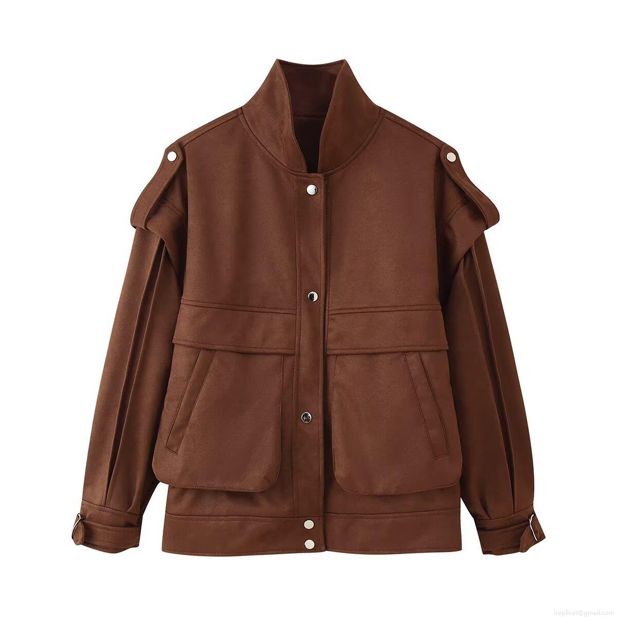 • Women's Faux Suede Jacket Streetwear Casual Loose Bomber Coat With Big Pockets High Neck Single Breasted Snap Buttons Outwear For Spring Autumn