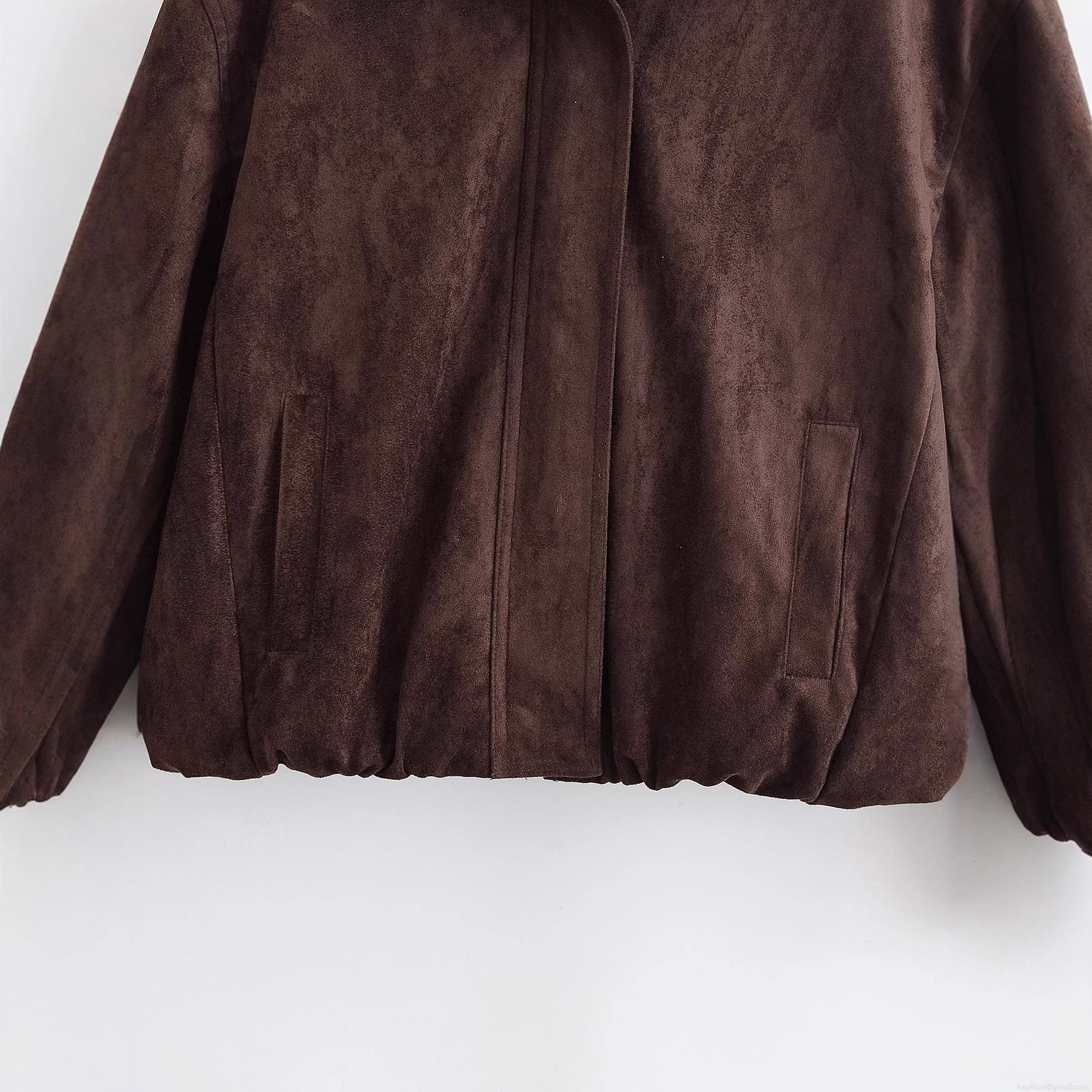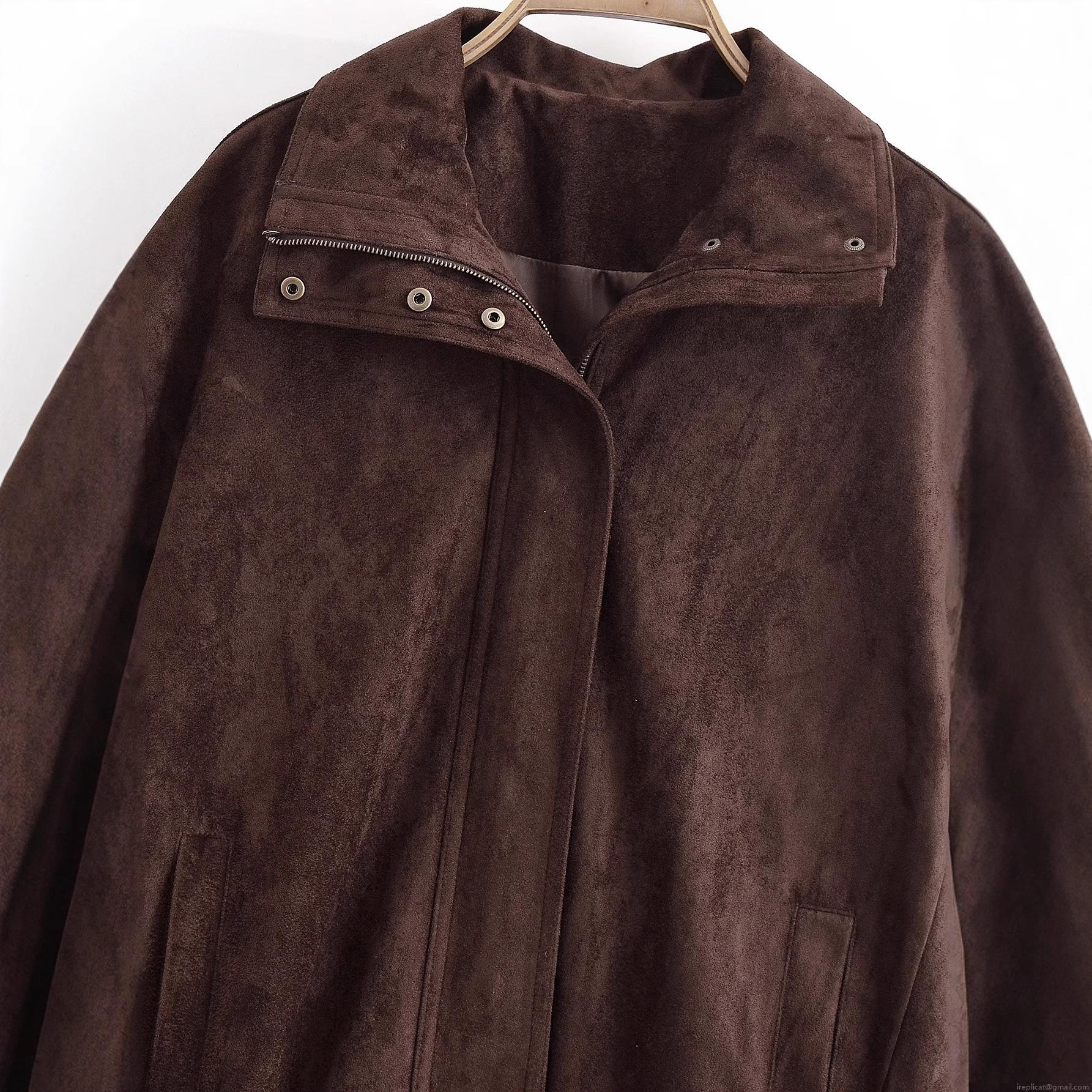 • Women's Faux Suede Jacket Vintage Dark Brown Loose Fit Lapel Zip Up Button Front Long Sleeve Outerwear Casual Streetwear Coat