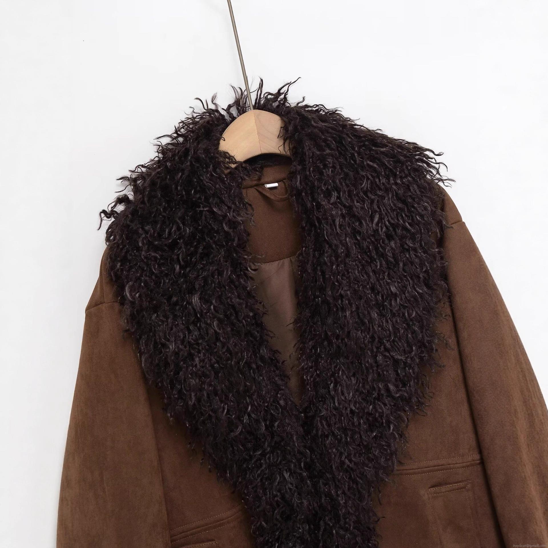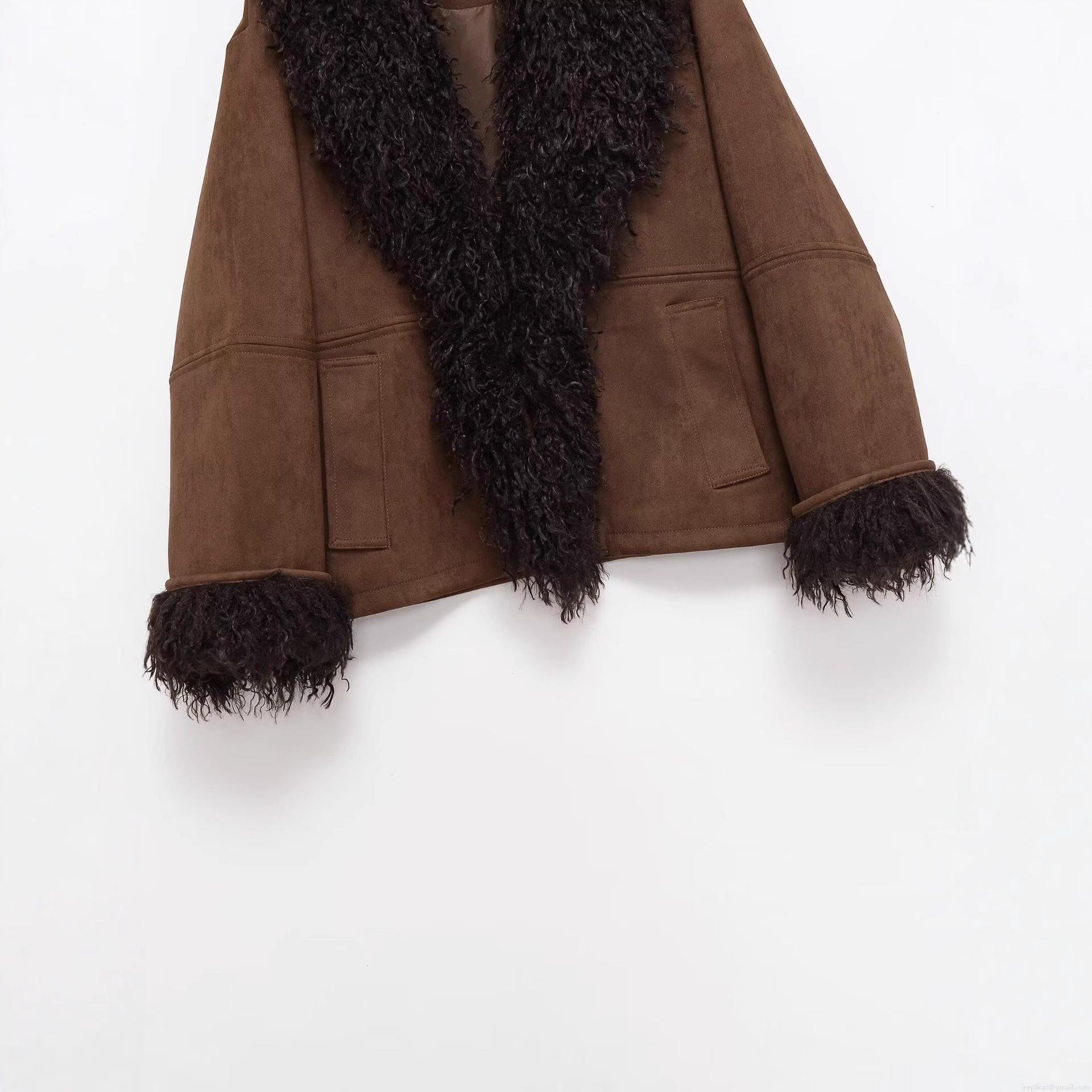 • Women's Faux Suede Jacket With Black Faux Fur Lapel Collar And Cuffs Solid Color Warm Long Sleeve Autumn Winter Fashion Outerwear Coat For Women