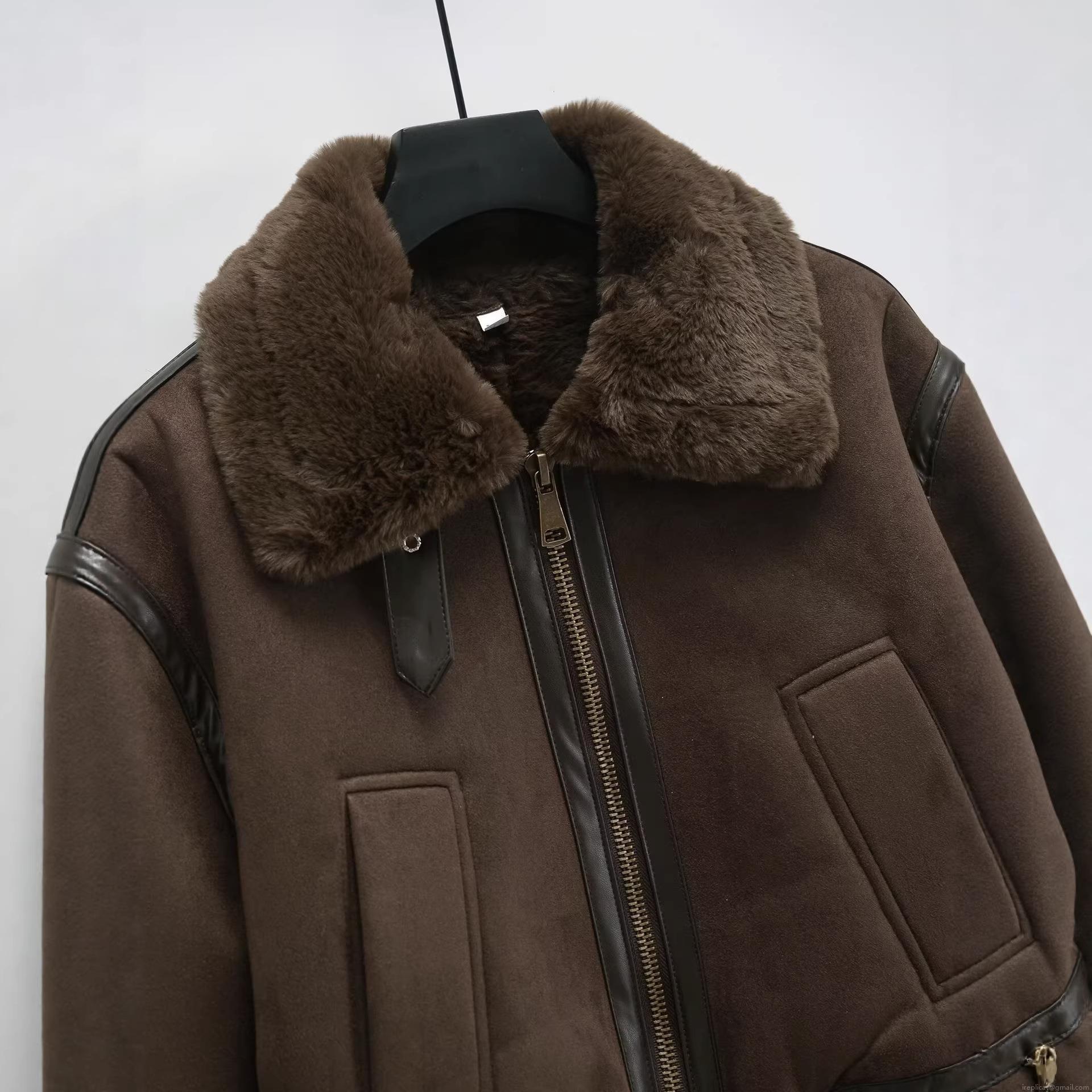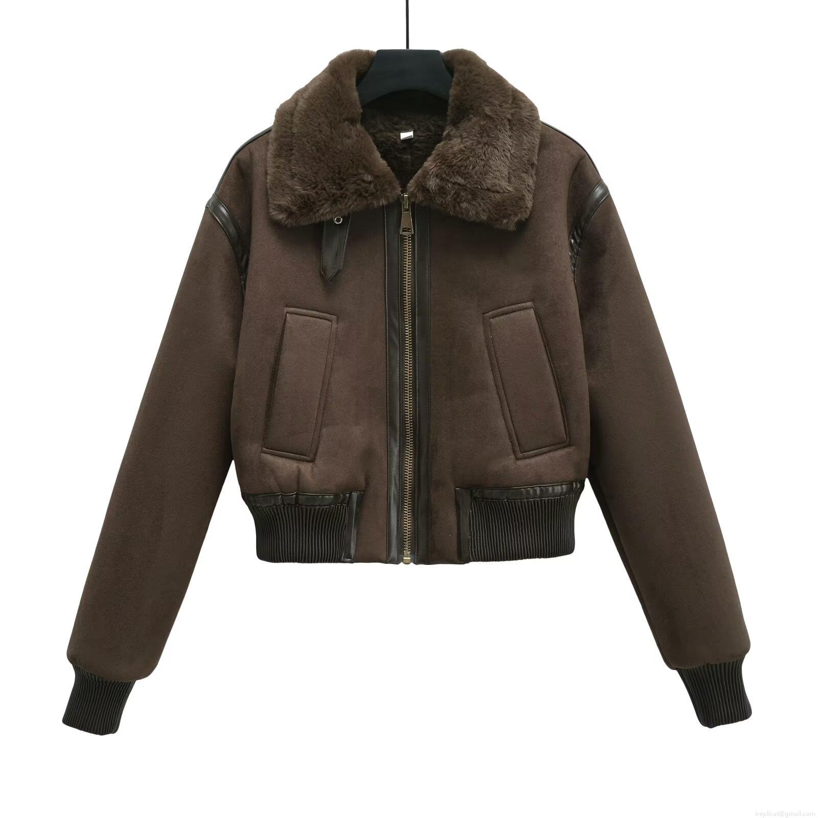 • Women's Faux Suede Shearling Aviator Flight Jacket Warm Winter Zip Up Coat With Fur Collar Patchwork Leather Trim Outwear Streetwear
