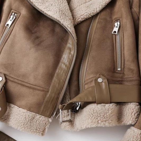 Women's Faux Suede Shearling Biker Jacket Fashion Moto Coat With Faux Fur Lining And Belt Winter Warm Outwear Casual Solid Color Thick Jacket