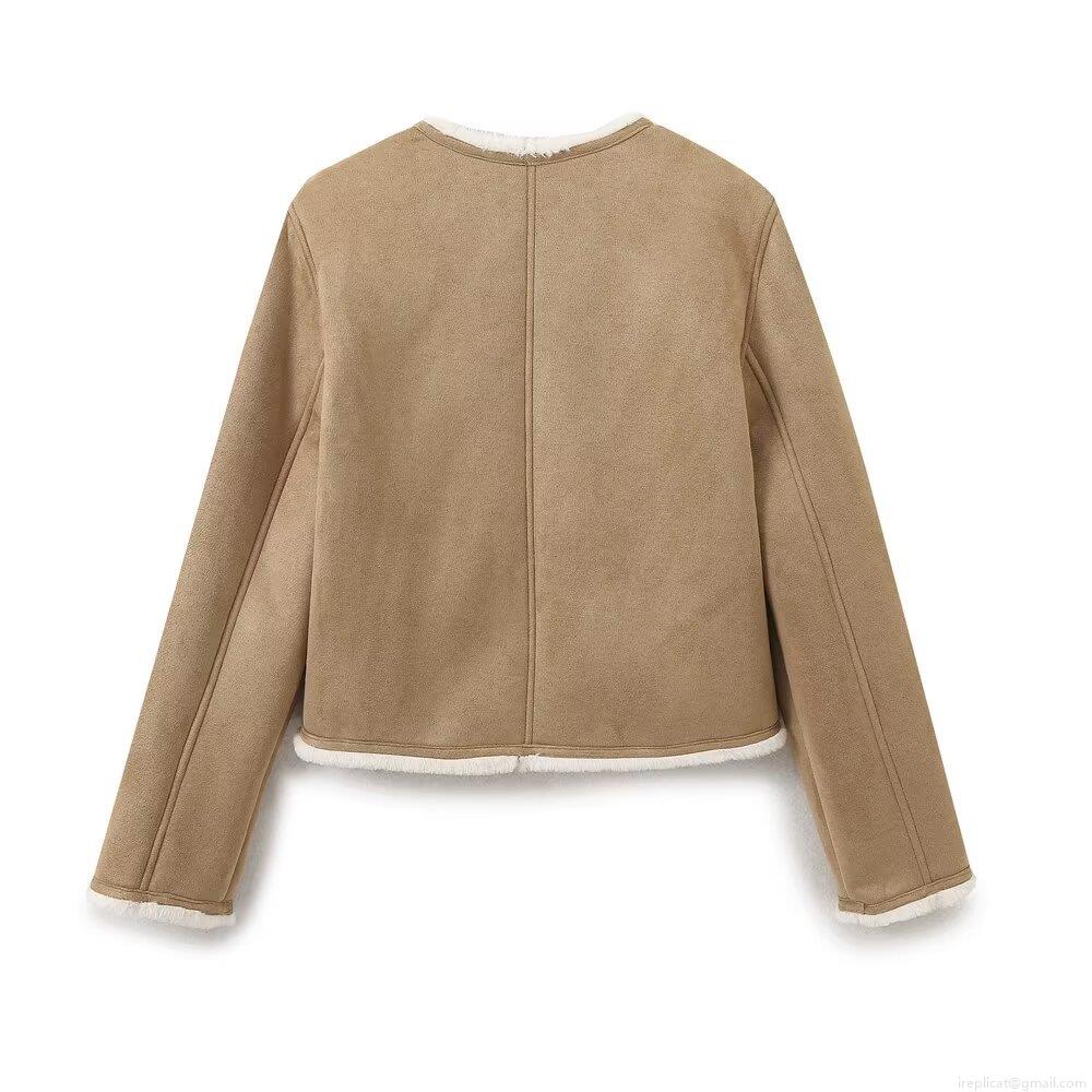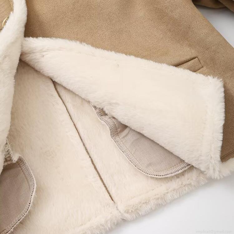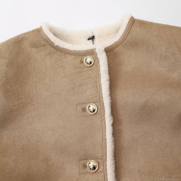 • Women's Faux Suede Shearling Jacket Warm Fleece Lined Outerwear With Gold Buttons Casual Round Neck Short Coat For Winter Daily Wear Ladies Fashion