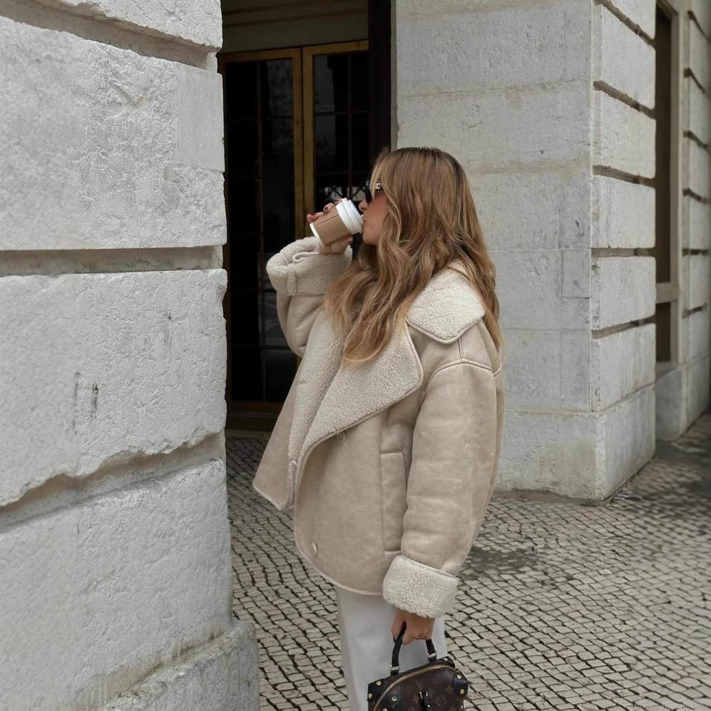 • Women's Faux Suede Shearling Jacket Warm Lamb Wool Lined Coat Fashion Lapel Single Breasted Short Outerwear For Winter Casual Streetwear