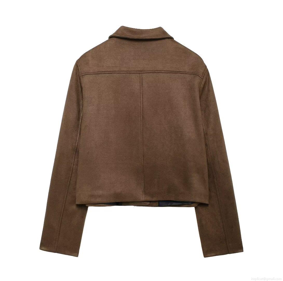 Women's Faux Suede Short Jacket Lapel Collar Long Sleeve Streetwear Fall Coat With Pockets Solid Color Single Breasted Polyester Outerwear For Ladies