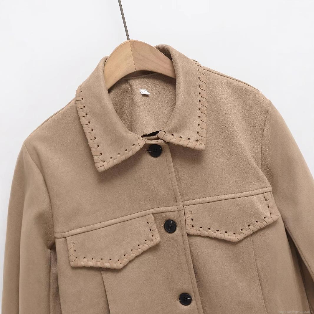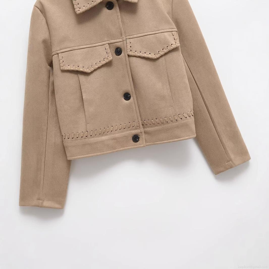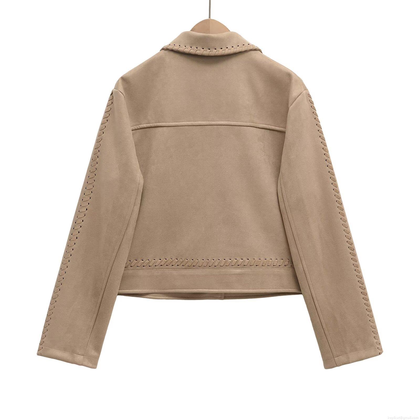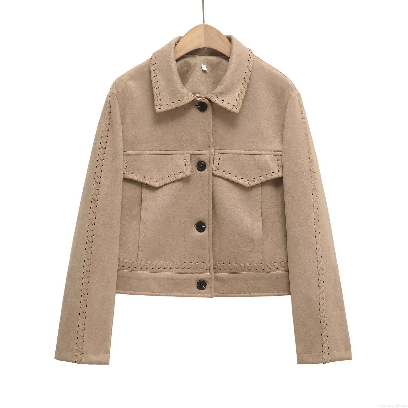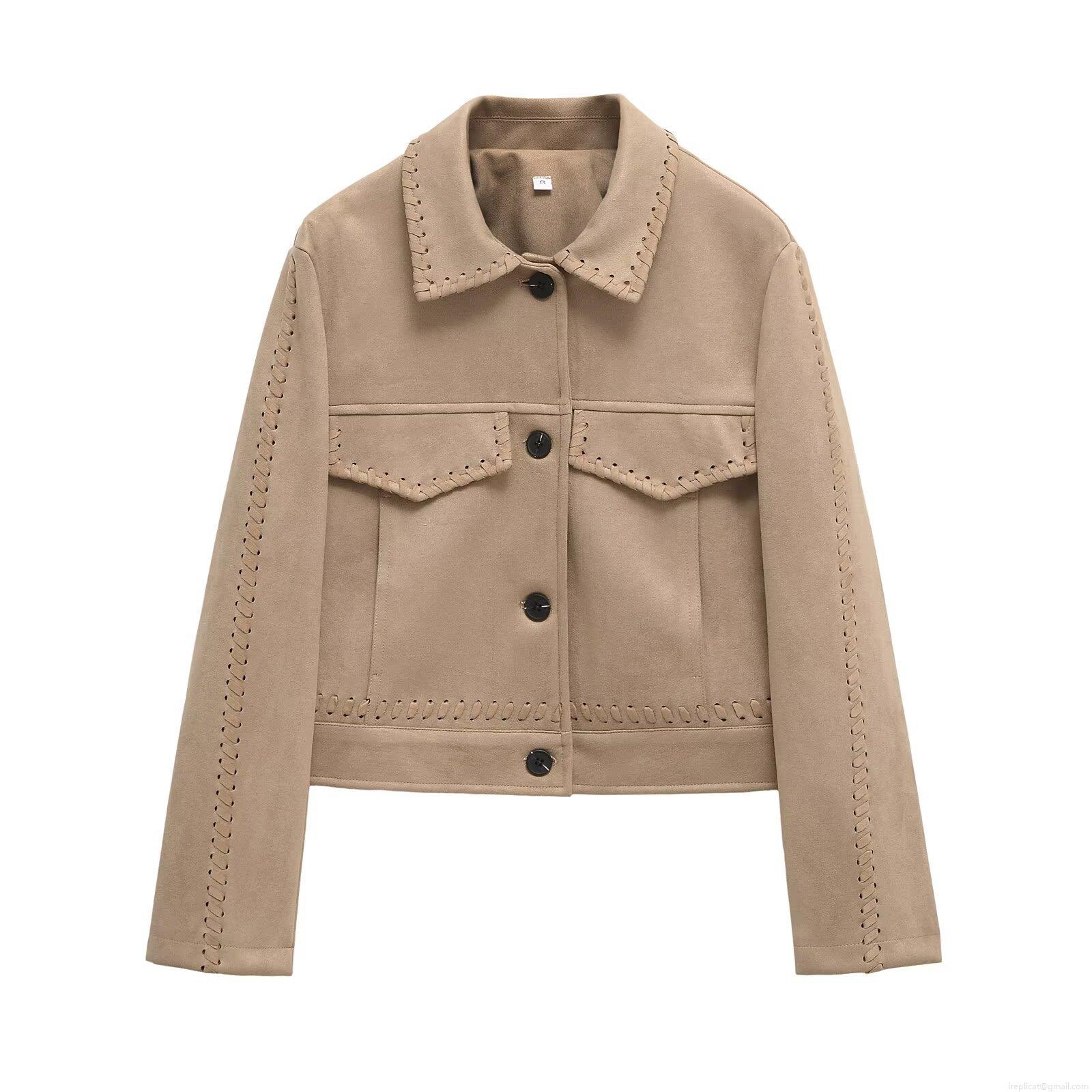 • Women's Faux Suede Short Jacket Vintage Khaki Lapel Button Down Coat With Woven Stitching Detail Casual Outerwear For Autumn Winter