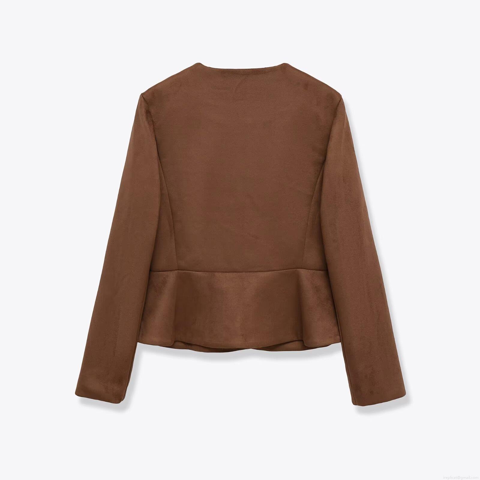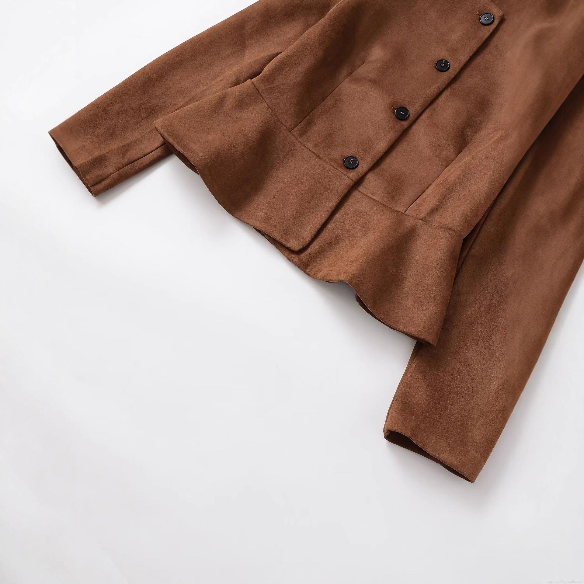 Women's Faux Suede Single Breasted Jacket Round Neck Long Sleeve Outerwear With Ruffle Hem Autumn Solid Color Casual Streetwear Coat