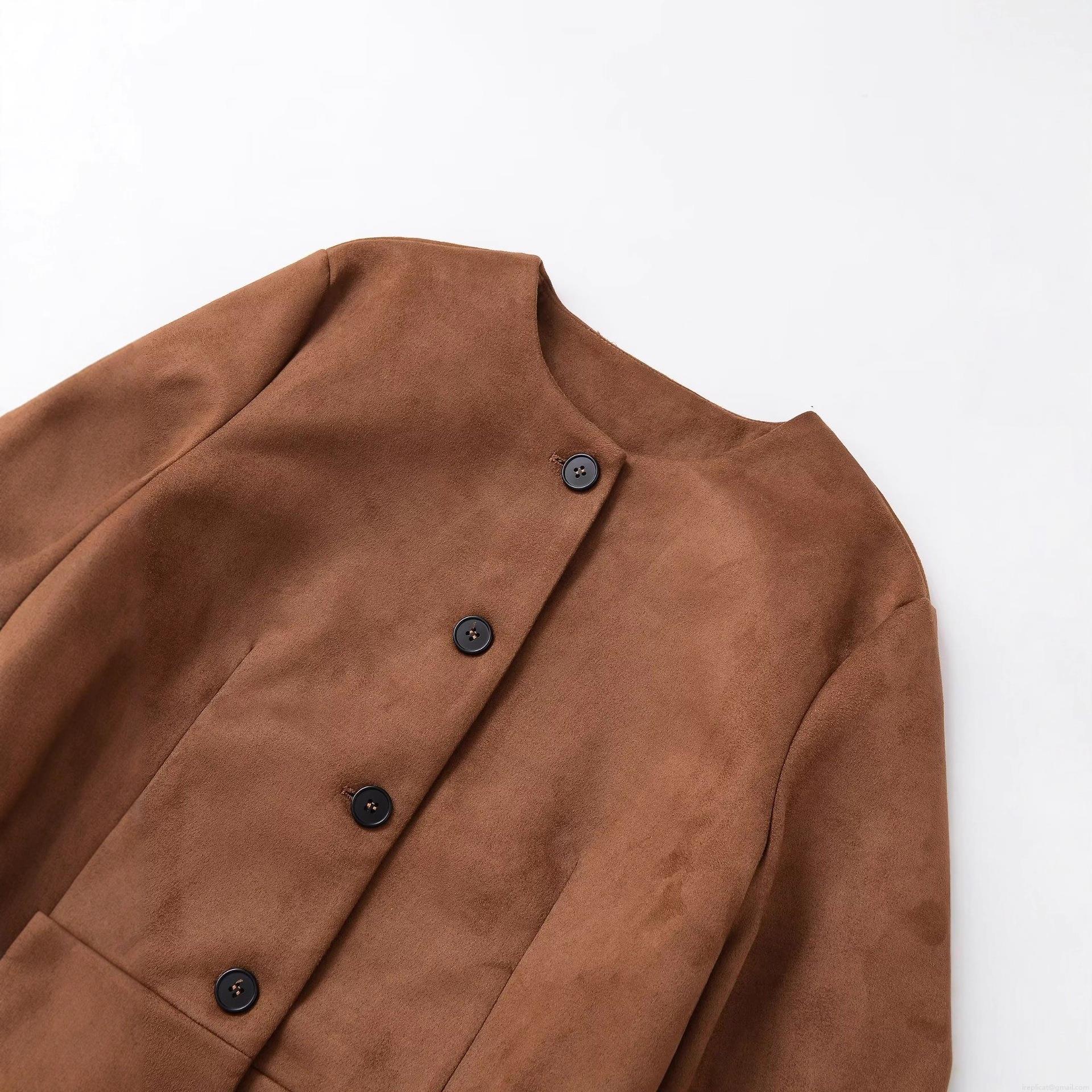 • Women's Faux Suede Single Breasted Jacket Round Neck Long Sleeve Outerwear With Ruffle Hem Autumn Solid Color Casual Streetwear Coat