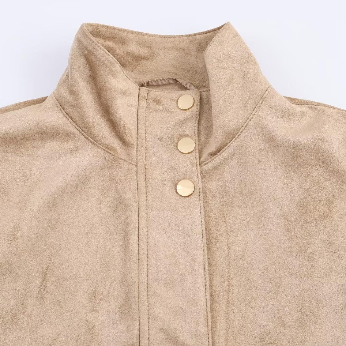 • Women's Faux Suede Stand Collar Jacket Casual Solid Color Long Sleeve Coat With Metal Snap Buttons And Side Pockets For Autumn Winter Daily Wear
