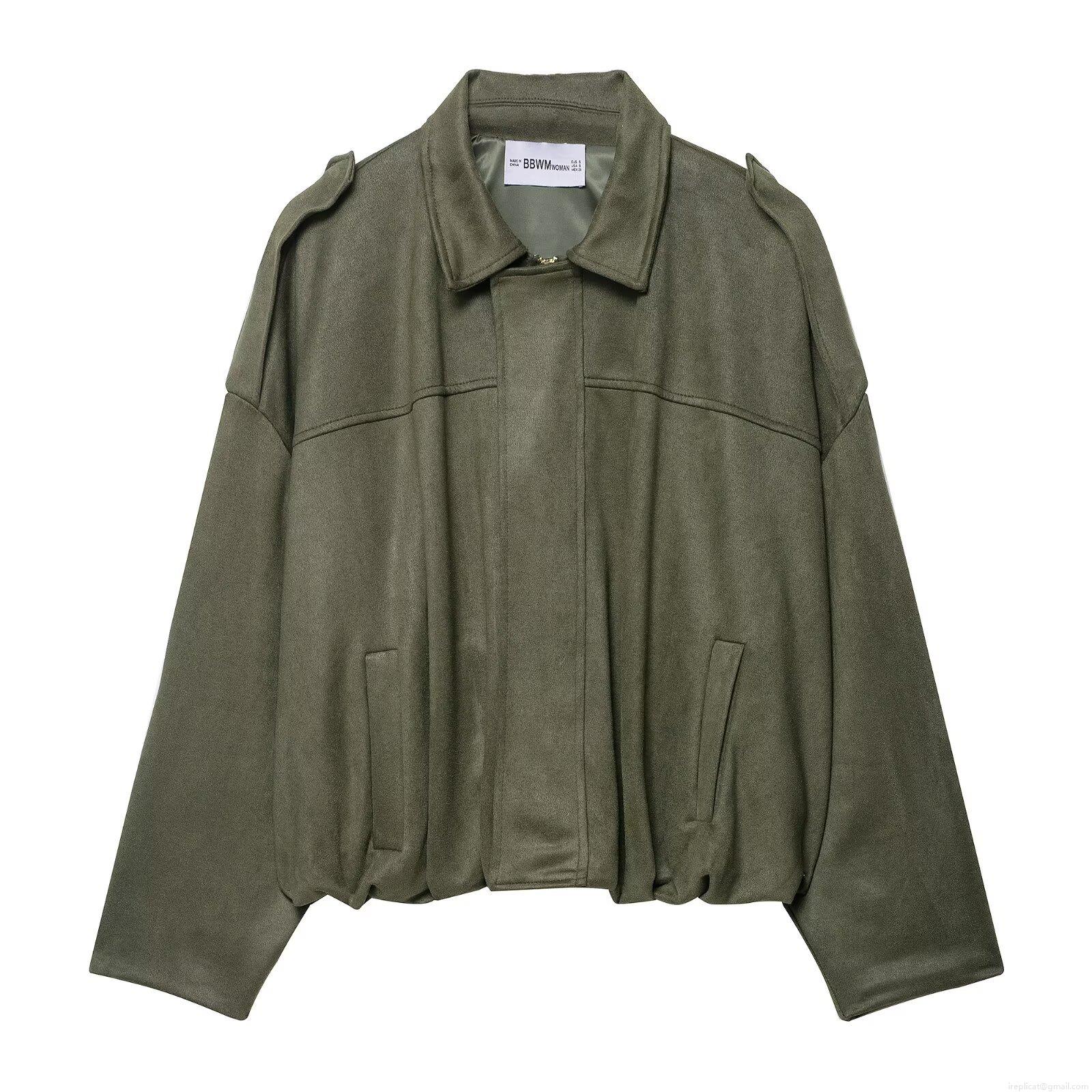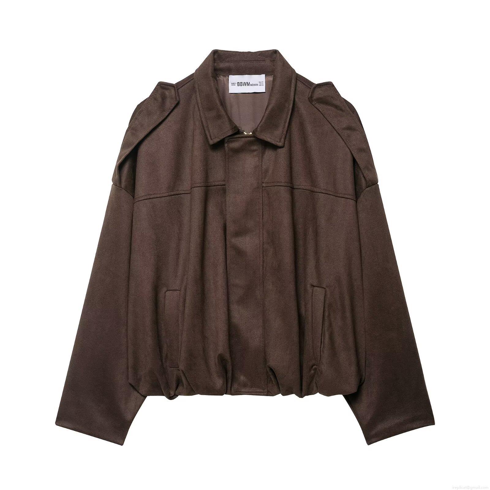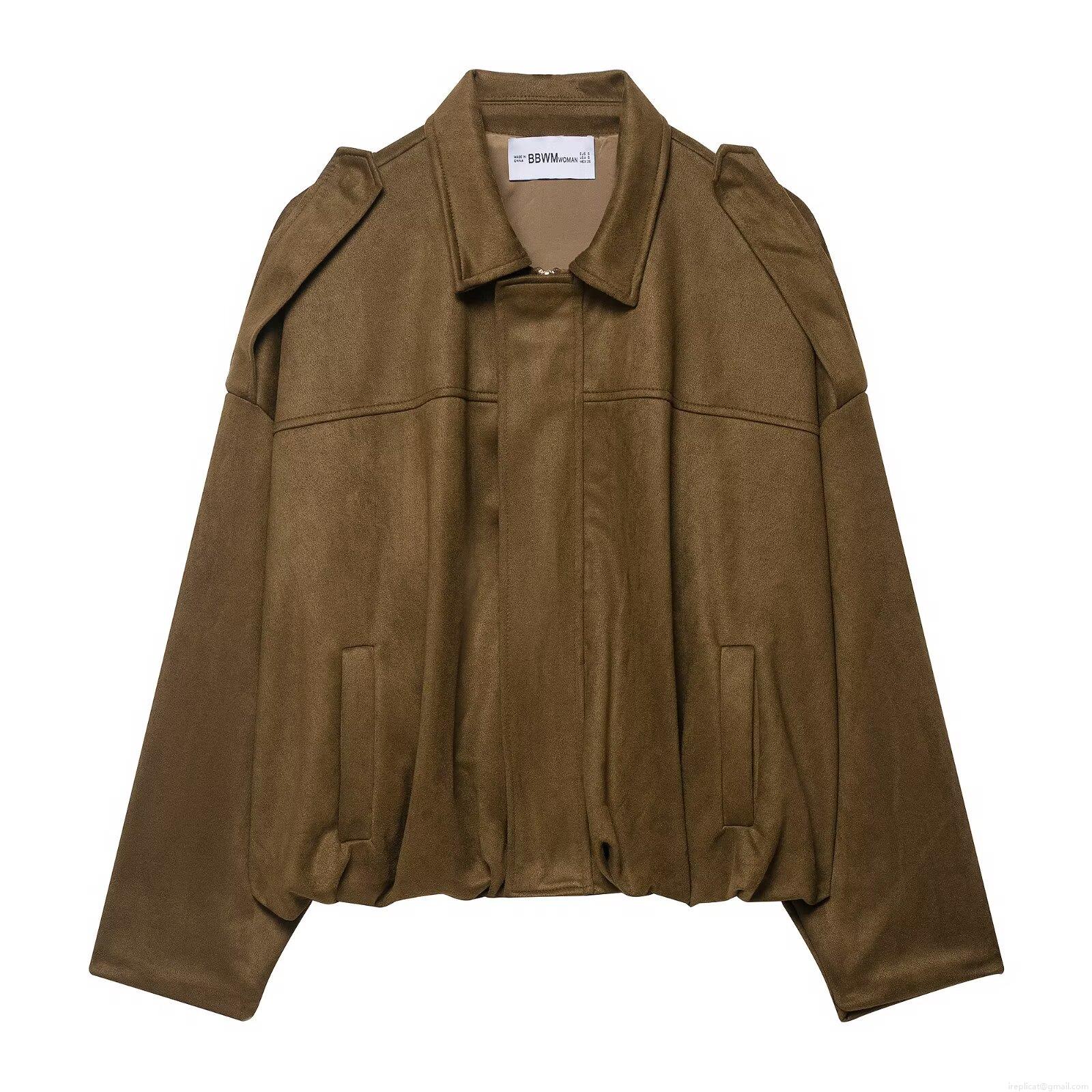 • Women's Faux Suede Zip Up Jacket Lapel Collar Loose Fit Baseball Coat With Pockets And Shoulder Straps Vintage Streetwear Outerwear For Autumn Winter