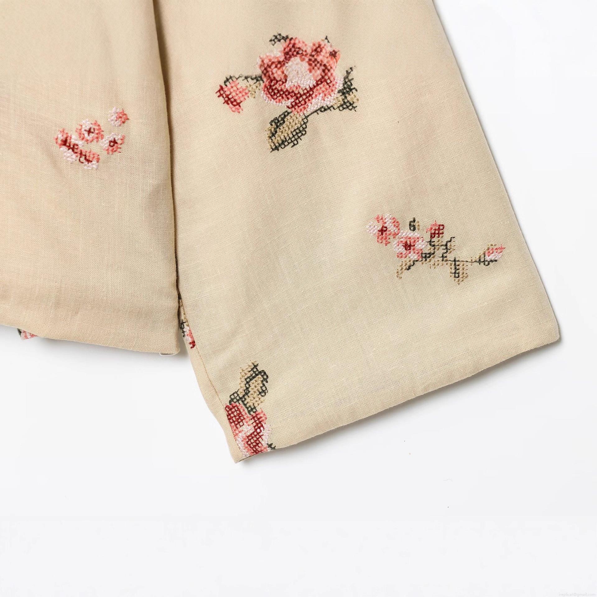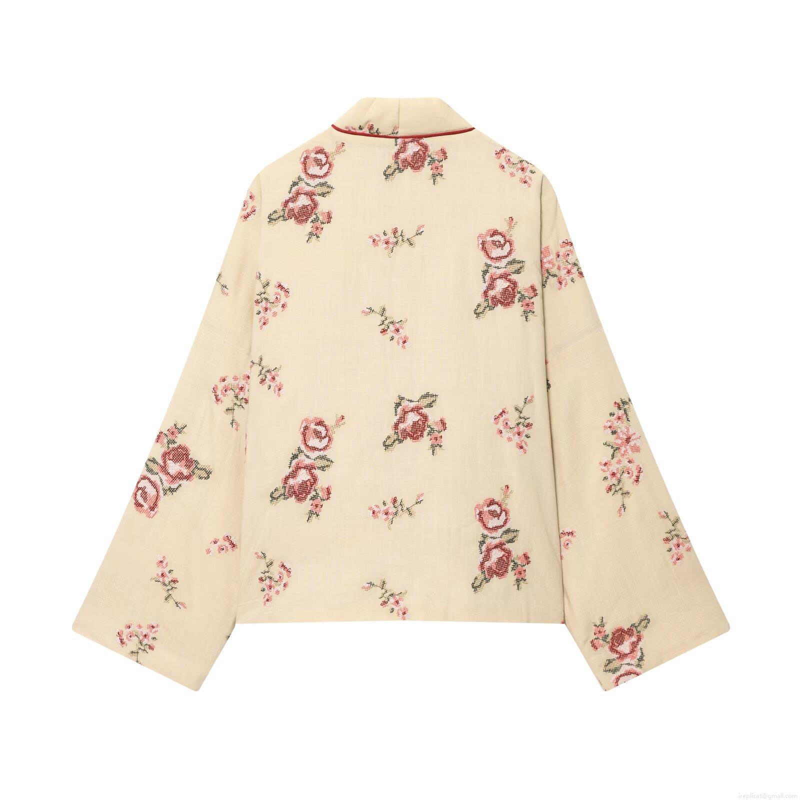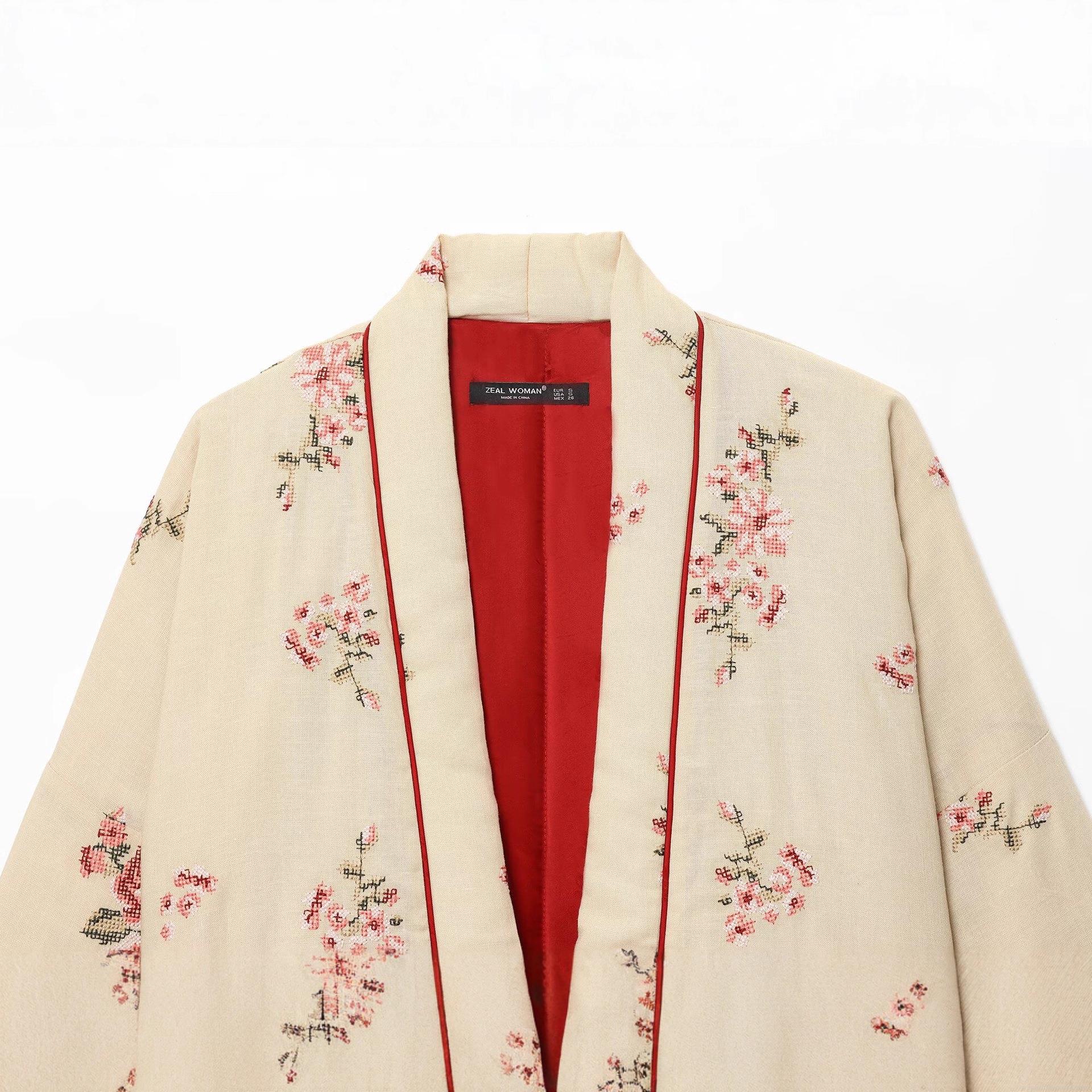 • Women's Floral Embroidered Polyester Cotton Padded Jacket With V-Neck Lace-Up Design Retro Kimono Style Loose Fit Beige Outerwear Winter Coat