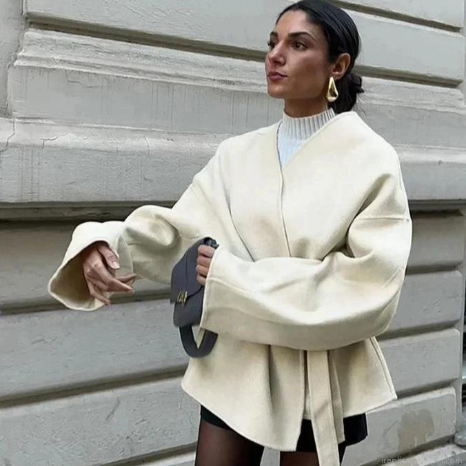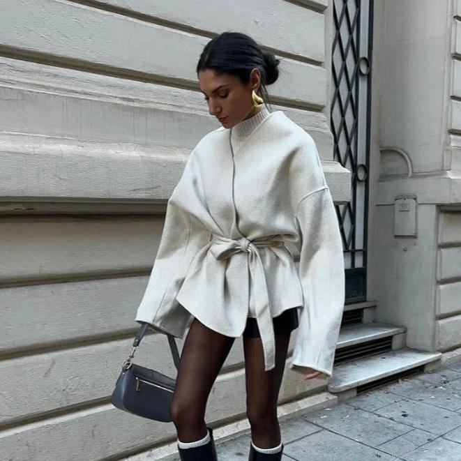 • Women's French Style Woolen Feel Jacket Loose Casual Outerwear With Tie Belt Solid Color Lapel Long Sleeve Coat For Autumn Winter Streetwear Lady