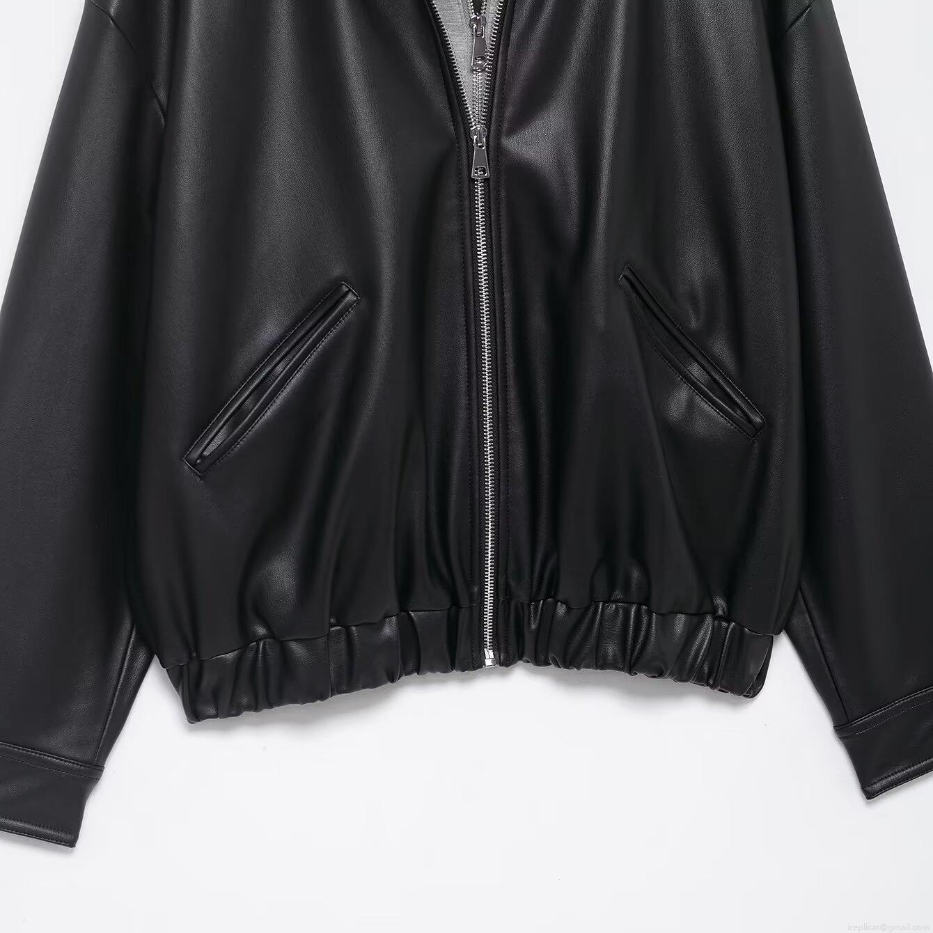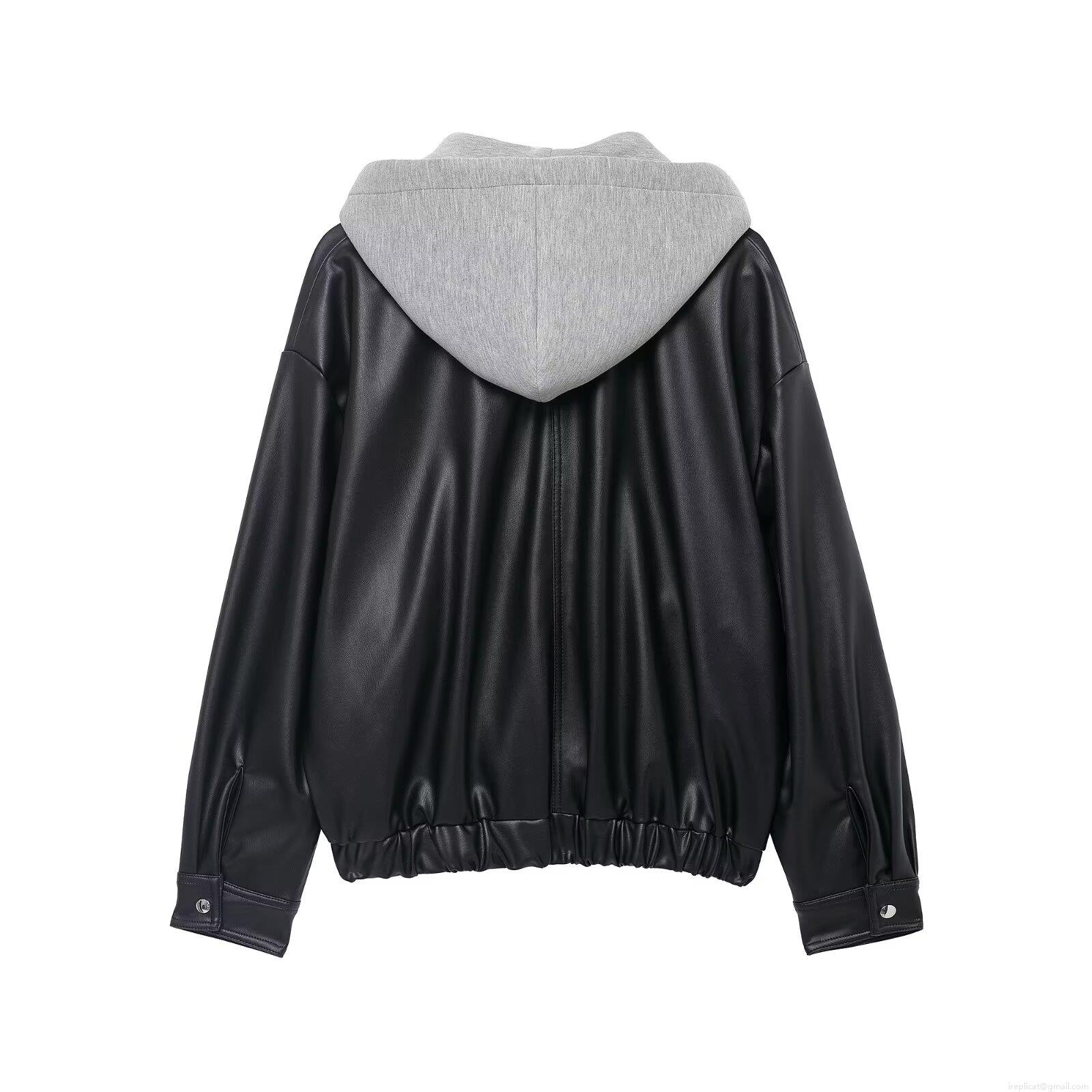 Women's Hooded Faux Leather Jacket Casual Patchwork Long Sleeve Zipper Coat With Knit Hood Loose Fit Streetwear Outwear For Autumn Winter Ladies