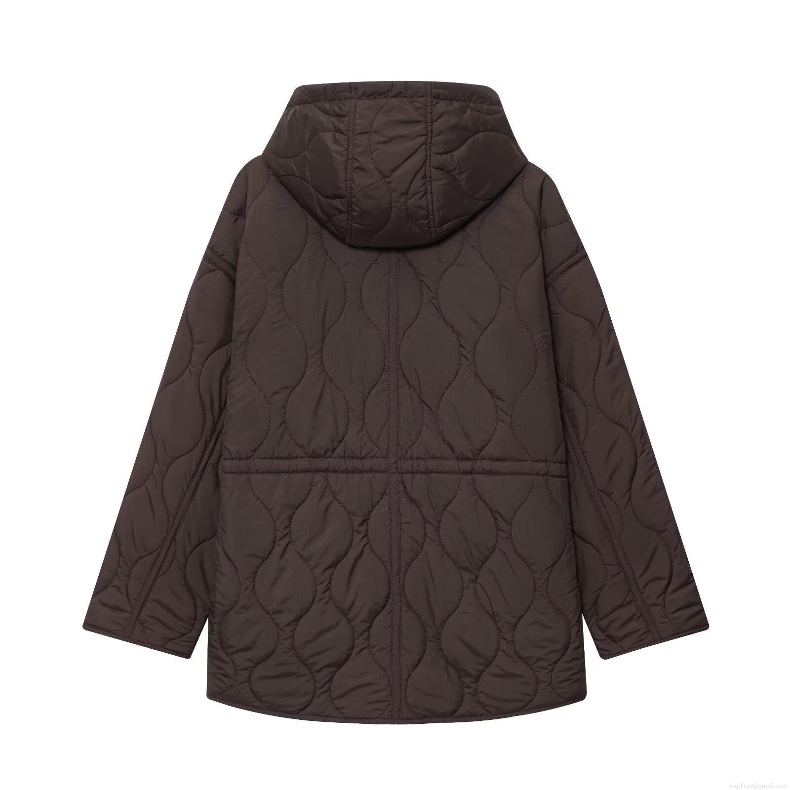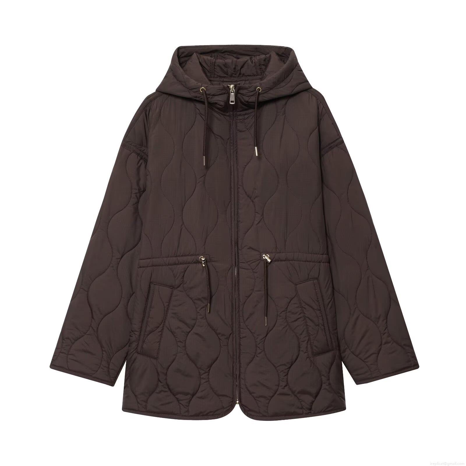 • Women's Hooded Quilted Coat Polyester Cotton Blend Wave Quilted Jacket With Waist Drawstring Casual Lightweight Windproof Puffer Outerwear For Autumn Winter Ladies