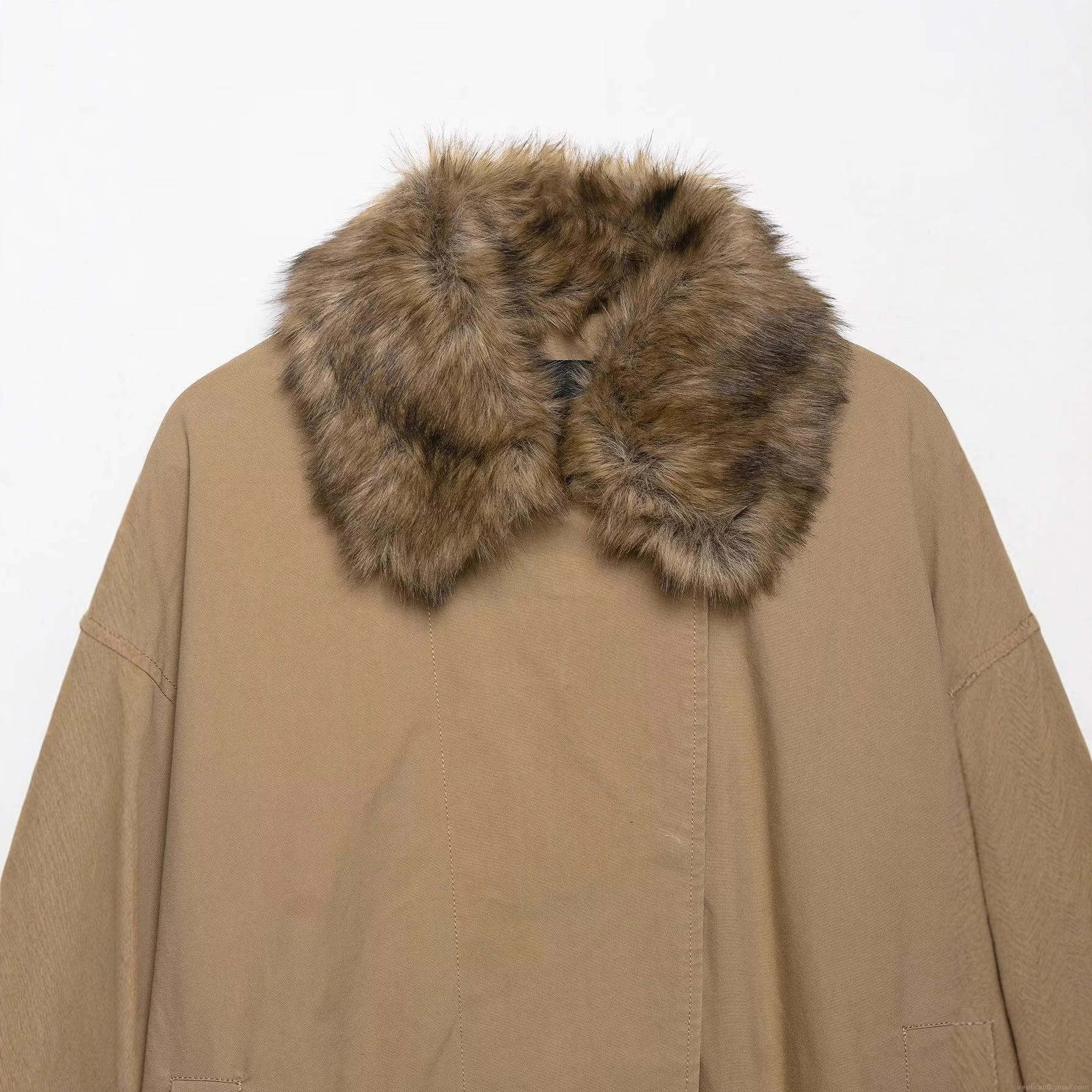 • Women's Khaki Faux Fur Collar Bomber Jacket Polyester Twill Loose Fit Windproof Outwear Coat for Winter Autumn Streetwear Casual Style